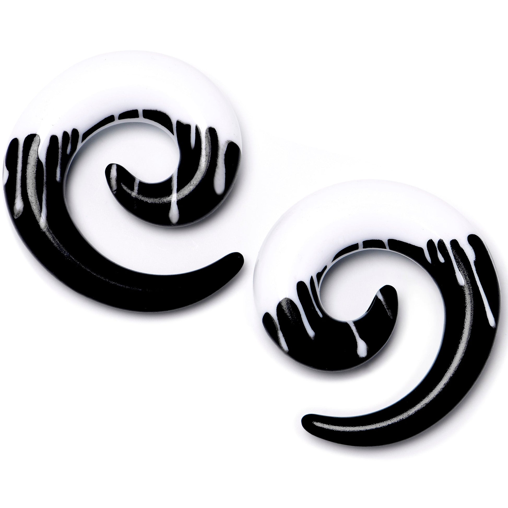 Hypoallergenic jewelry for sensitive skin.0 Gauge Black White Reverse Drip Acrylic Spiral Taper Set