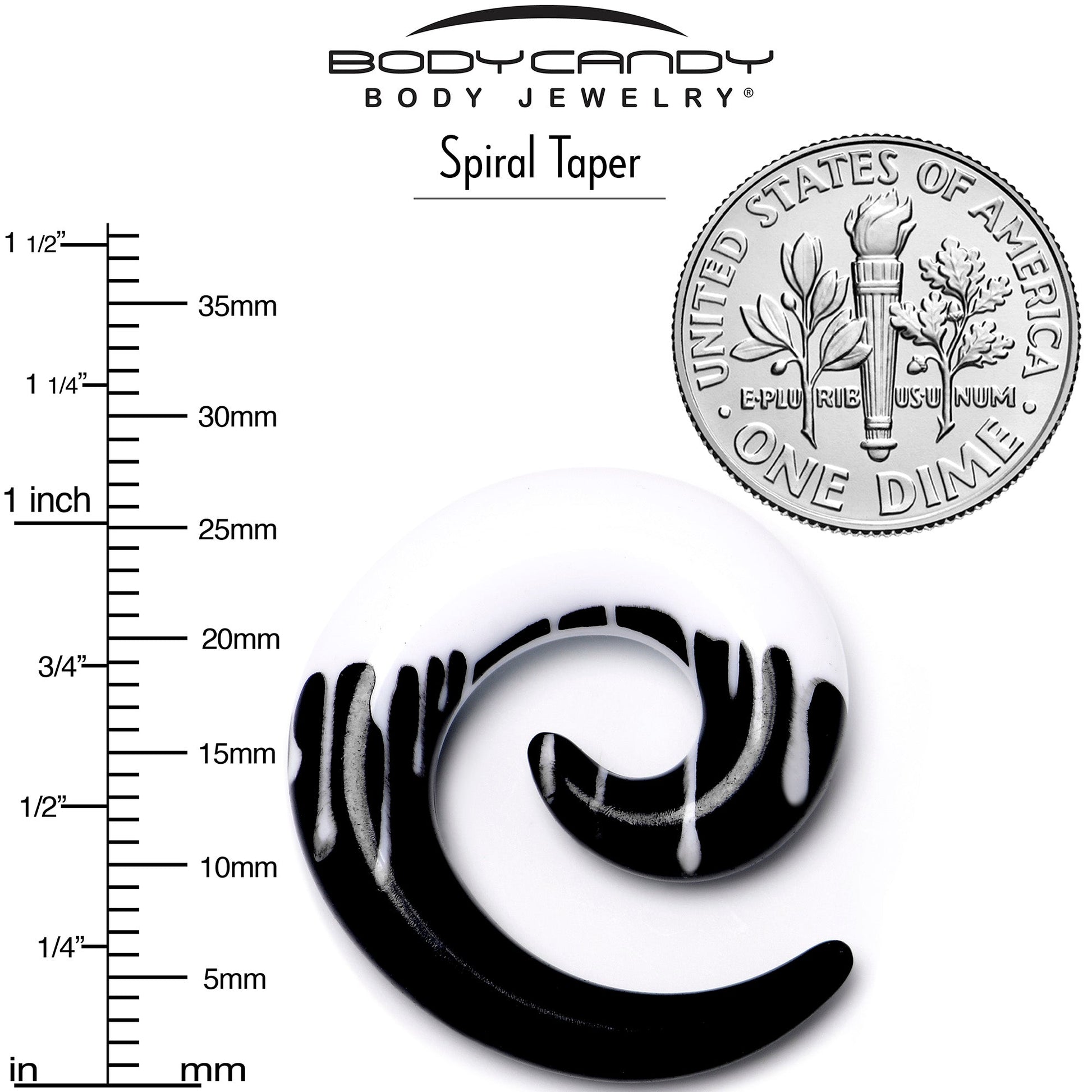 Your look will be dripping with gothic glamour when you are rocking these spooky 8mm spiral plugs for stretched ear lobes. They are made with acrylic and feature a spiral taper design for comfortable insertion. They feature a white drip-look design on a black background for a look that is full of eye-catching contrast. Why be a drip when you can be a diva and rock these stylishly spooky taper plugs. Sold as a set of two.Specifications