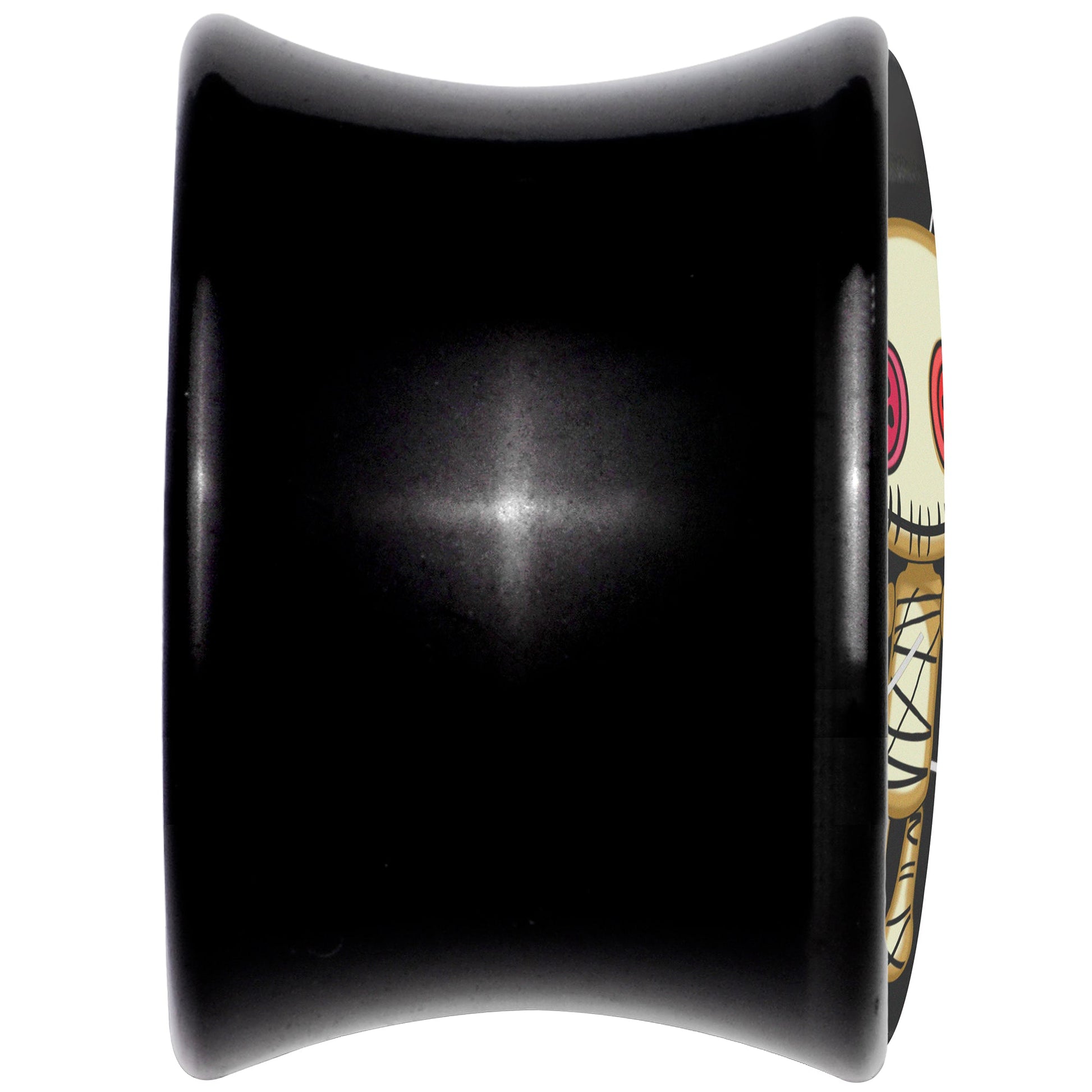Get a magical look that is totally haunting with these 8mm saddle plugs for stretched lobes. They're made with black acrylic and feature a saddle design for comfortable insertion and removal. Each one features a creepily empty-eyed voodoo doll, with pins sticking out of it. They are depicted on a black background to really make the details pop. Give your look a poke it will really feel when you're rocking these adorably creepy voodoo doll ear gauges. Sold as a set of two.