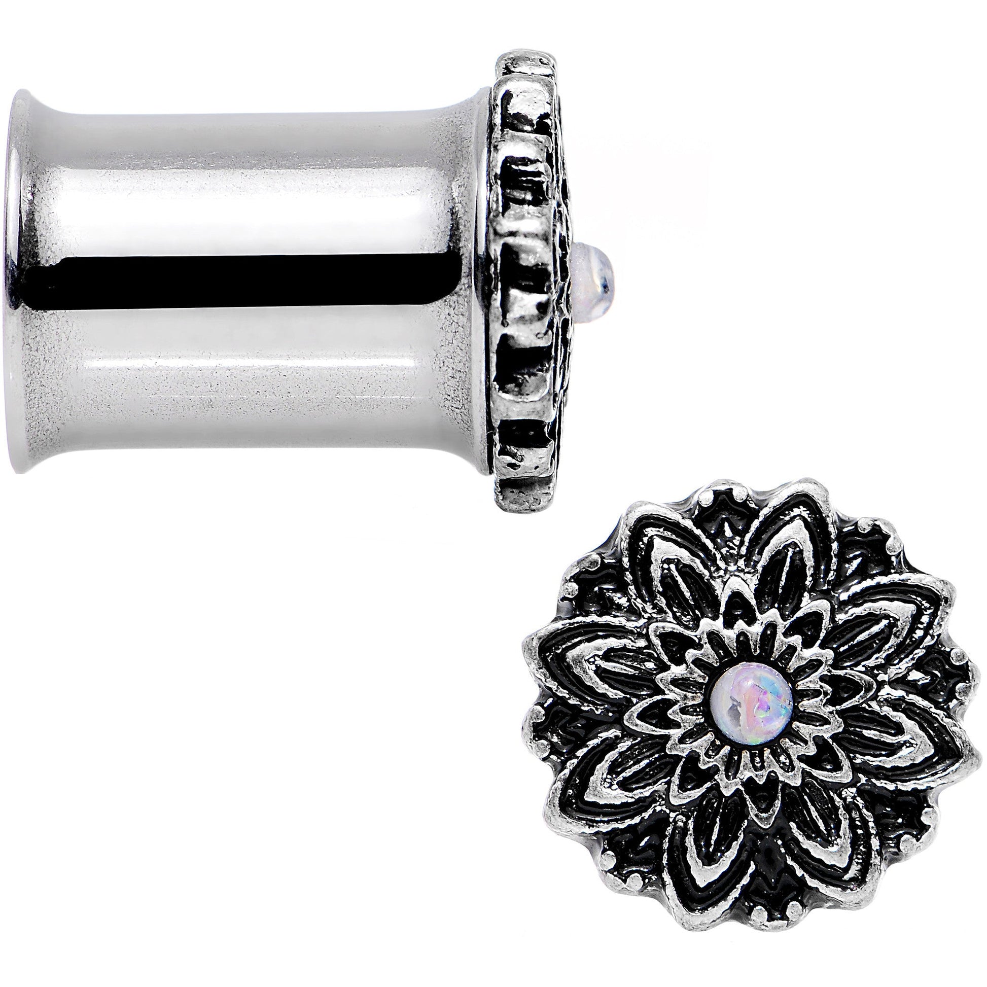 Try out this new take on floral fun when you treat yourself to this pair of unique ear plugs. Made from durable surgical grade stainless steel, these 8mm ear gauges feature a double flare design for stretched lobes, a single white synthetic opal set in a flower inspired circular frame, and are sold as a set of two. Whether you are ready for a perfectly pretty state of mind or a floral flair body jewelry find these plugs are perfect for you.