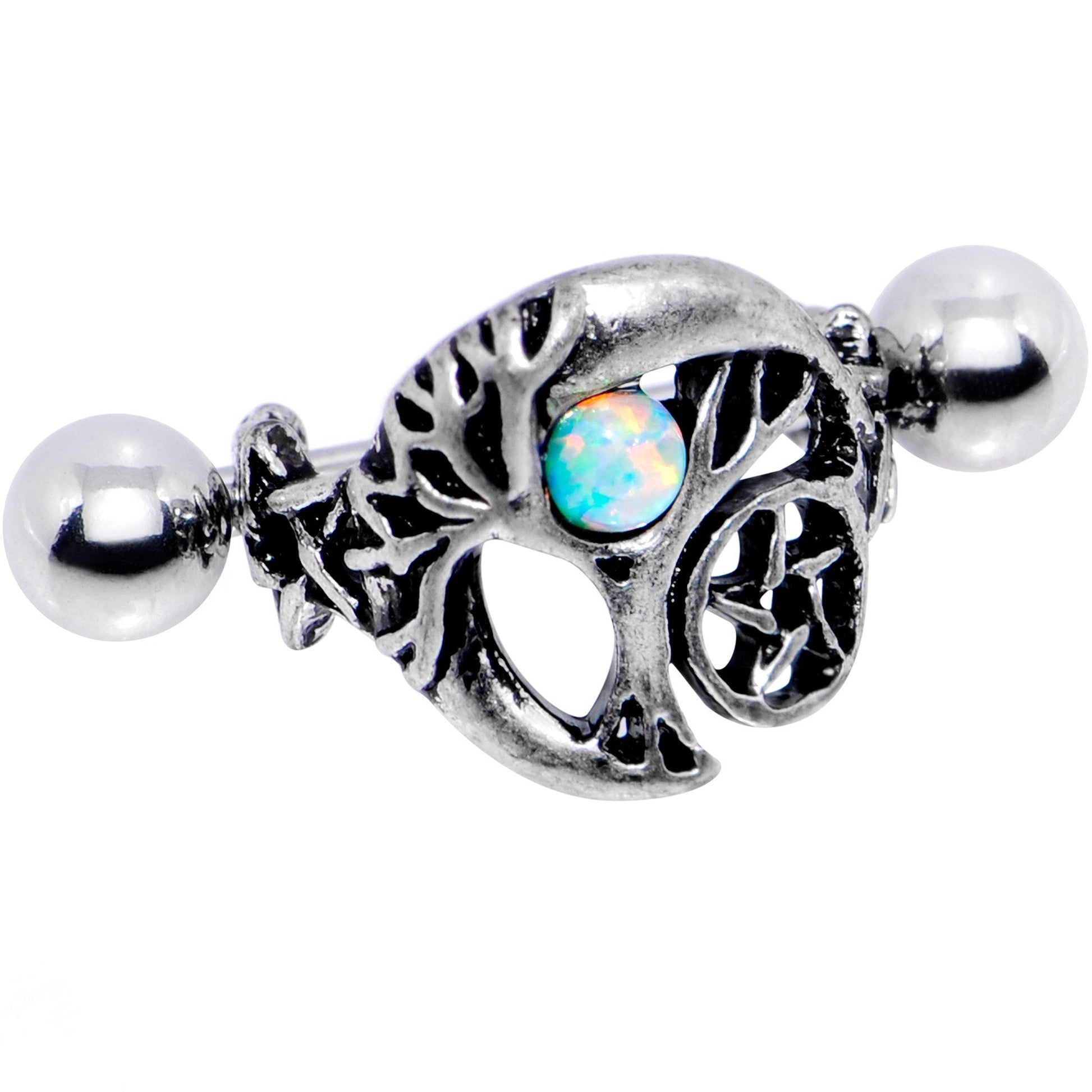 This mysterious tree has some mystic fruit. The intricate tree details are combined with a crescent moon and star on this 16 gauge helix cup is bearing a brilliant white synthetic opal. The charm is mounted on a 12mm straight barbell made with durable 316L surgical grade stainless steel. This fancy design wraps around your ear cartilage for a unique display.