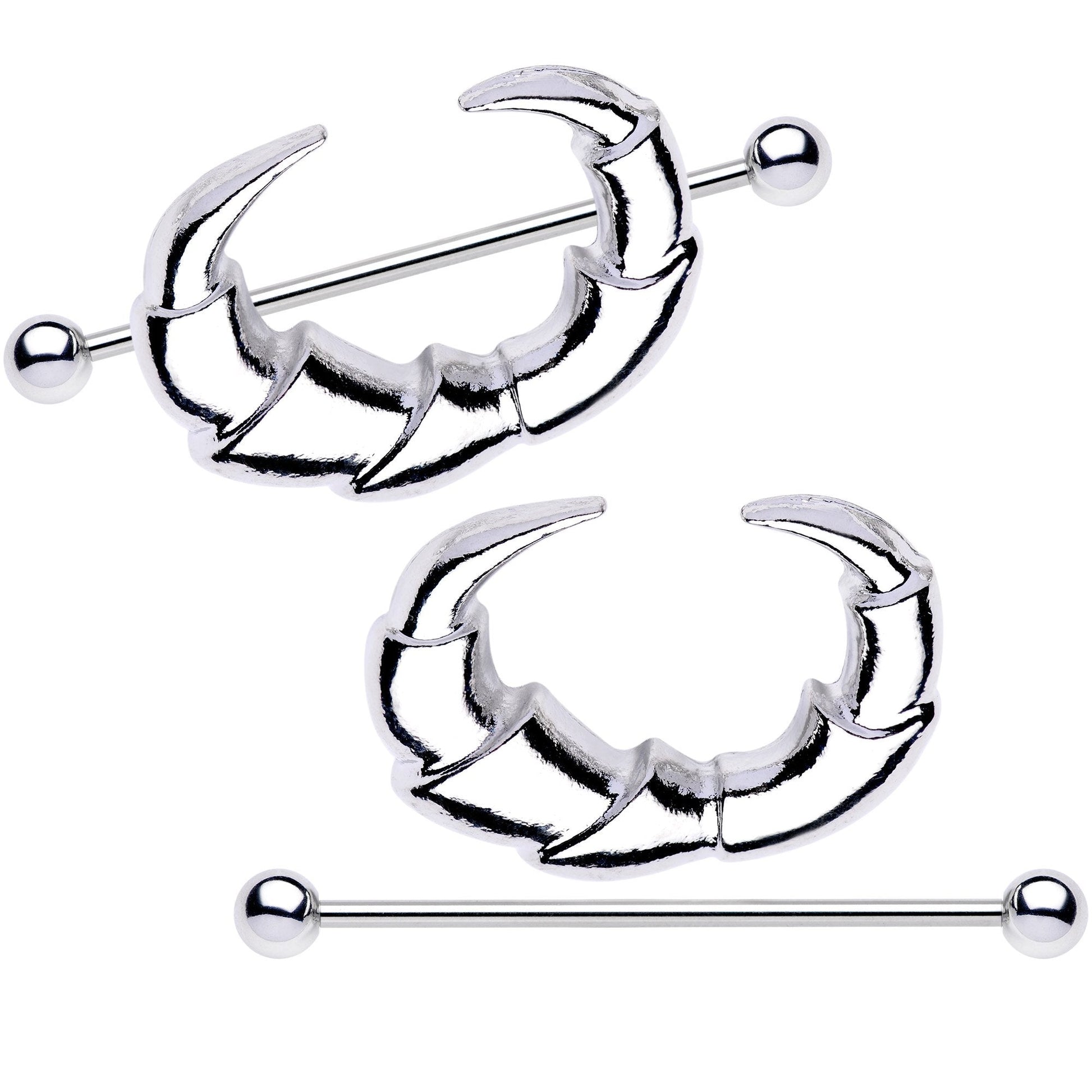 Now, these nipple shields are badass! Pick up this pair of claw tooth nipple rings to show off your badass side. These 14 gauge barbell nipple shields feature large, talon charms with long claws. The claw tooth charms are set on a pair of 35mm in length straight barbells made with durable 316L surgical grade stainless steel. Sold as a set of two!Specifications