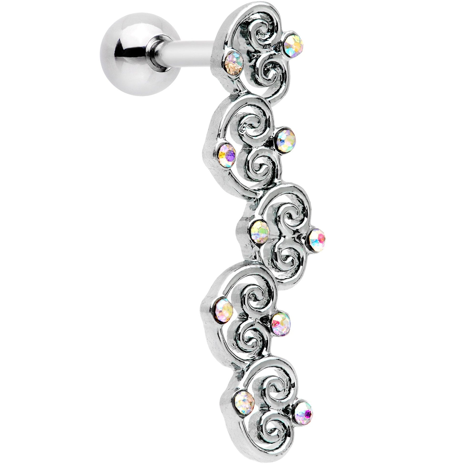 This cascade of swirling hearts will make your love for life be known. This 16 gauge cartilage piercing features a cascade of five swirl pattern hearts encrusted by beautiful aurora gems. The swirl heart cascade charm is mounted on a 6mm in length straight barbell made with durable 316L surgical grade stainless steel.Specifications