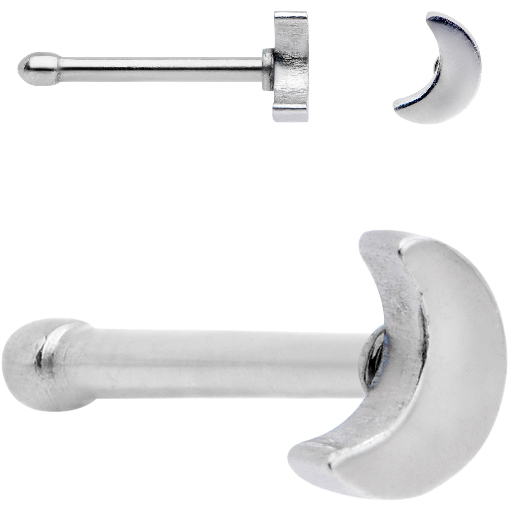 Make sure you have options for your pierced nose with this set of 6 nose rings in the nose bone design. These 20 gauge nostril rings have a length of 6mm and are made from durable 316L surgical grade stainless steel straight posts. Included in this package of 6 nostril rings are a nose piercing with a star top, a crescent moon, a clear gem press-fit end, a man in the moon charm, a ringed planet charm, and a plain ball end. These nose bone piercings are sold as a set of six.Specifications