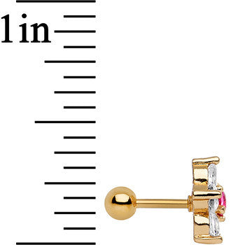 Mesmerize birds and bees alike with the vibrant pink centerpiece of the 10mm floral charm that decorates this tragus cartilage earring.The 1/4" gold anodized over 316L surgical grade stainless steel straight barbell is accented by the clear gem petals that surround the color in the middle of the sparkling prong-set design for a fashionable and functional piece of body jewelry for your cartilage piercing.