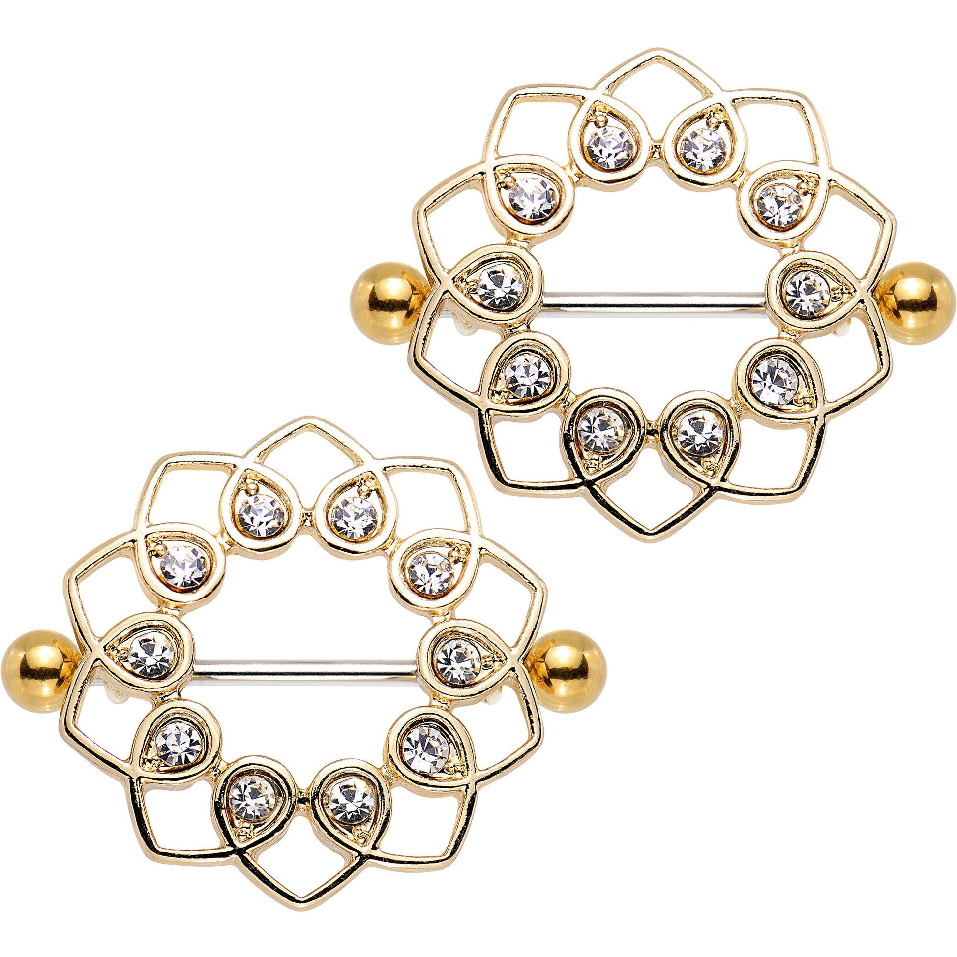Make sure you are always touched up with a little heartfelt style when you wear this pair of Valentine's Day inspired nipple shields. The 25mm length straight barbells used for this set of nipple jewelry are made from gold anodized over 316L surgical grade stainless steel, and this 14 gauge nipple ring set features a ring of hearts set with clear gems that forms an angelic 15mm diameter halo around your nipple and are sold as a set of two for pierced style just for you!