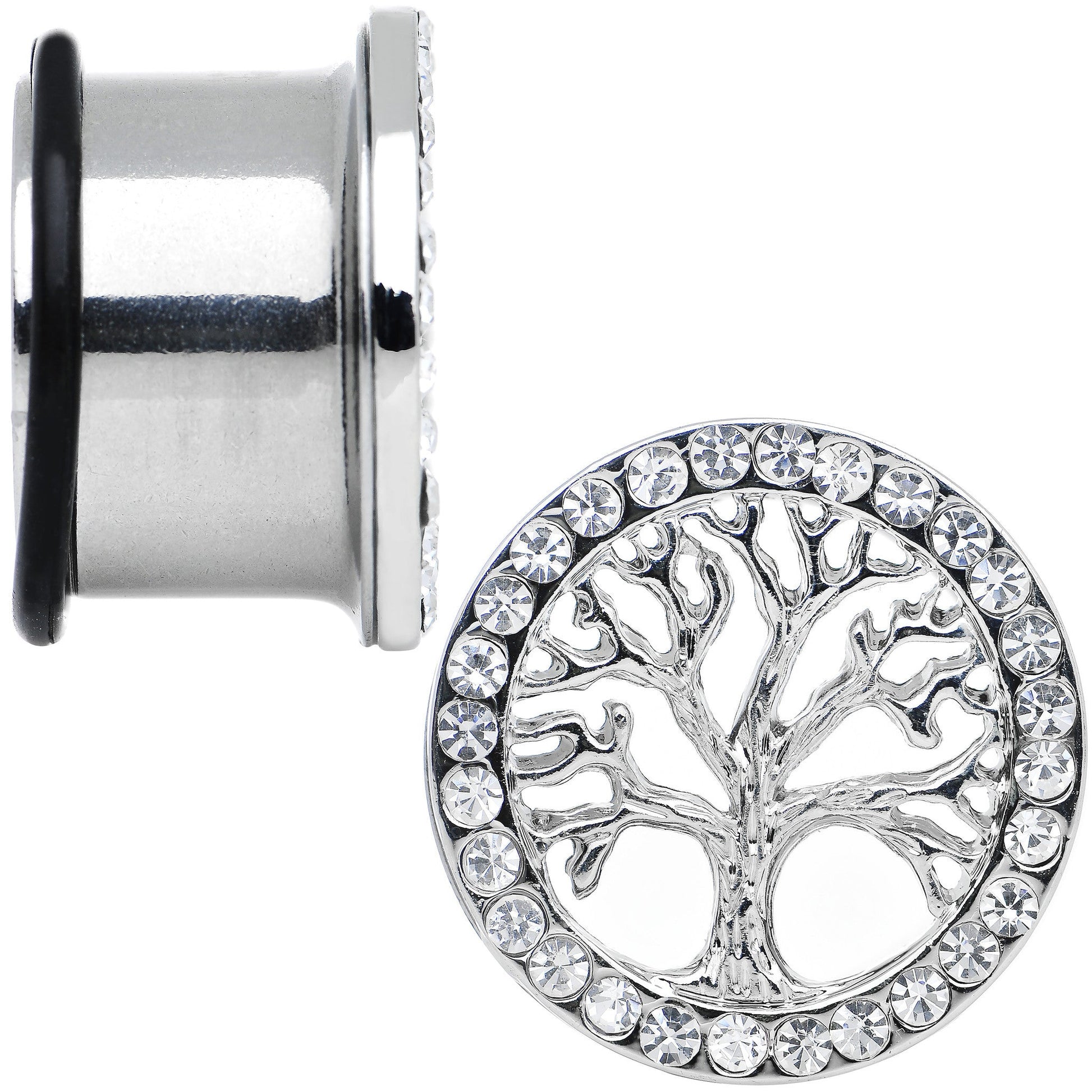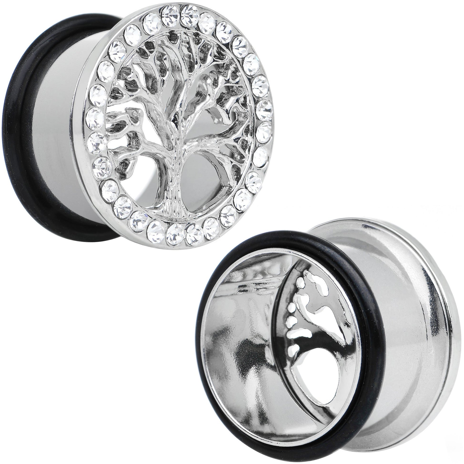 Hypoallergenic jewelry for sensitive skinThese 11/16" single flare tree of life plugs surrounded by clear gems are a must-have for any plug jewelry wearer who is looking for something that is both spiritual and stylish. Made of 316L surgical grade stainless steel and worn with rubber o-rings, these ear gauges are sold in sets of two.