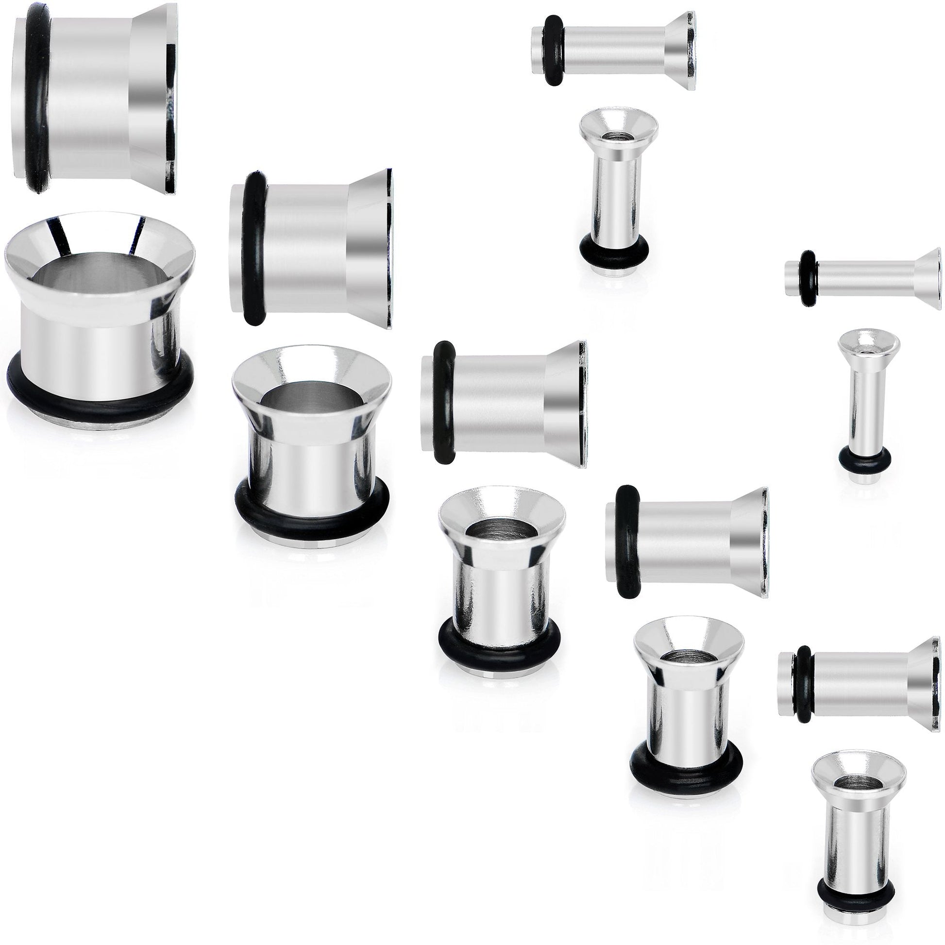 Includes One (1) of Each Size Tunnel: 12 Gauge (2mm), 8 Gauge (3.2mm), 6 Gauge (4mm), 4 Gauge (5mm), 2 Gauge (6mm), 0 Gauge (8mm), 00 Gauge (10mm), 316L Surgical Grade Stainless Steel, Rubber O-Rings, Sold as a Set of 7 Pairs