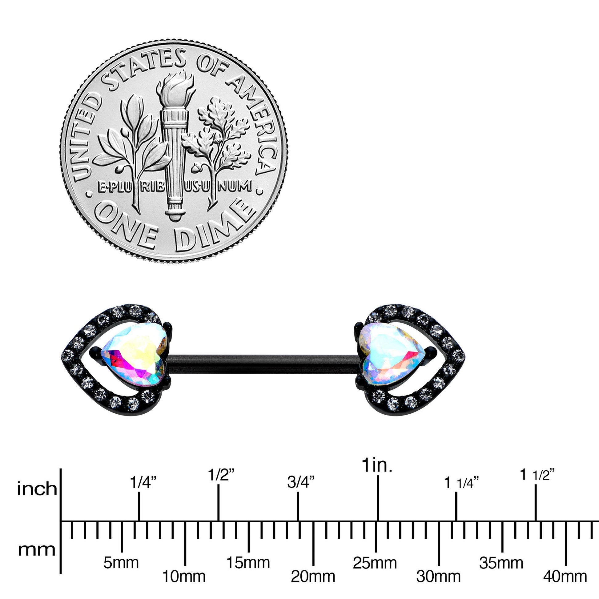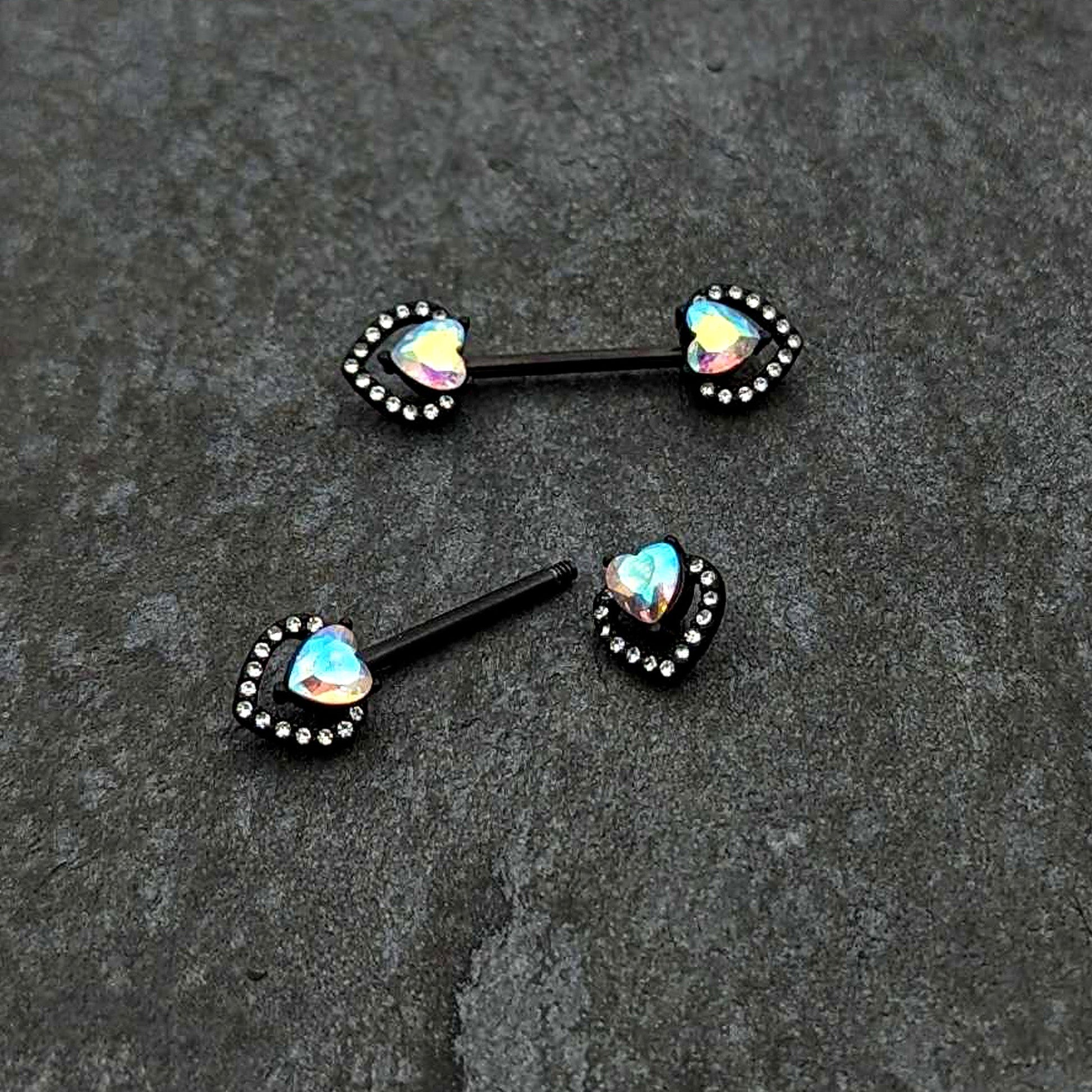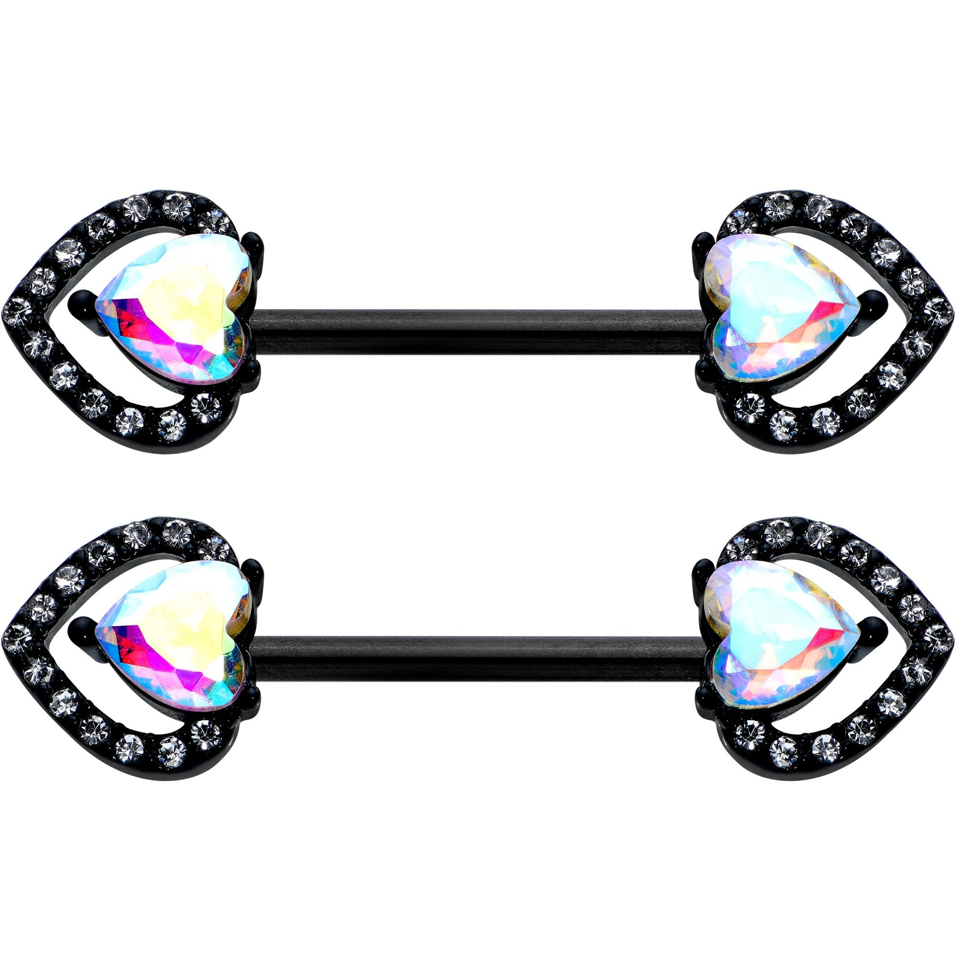 Look luxe and love it without breaking the bank with this 14 gauge nipple jewelry! It's made with 14mm black PVD over 316L surgical grade stainless steel straight barbells. Each of the ends features a double heart charm, with the outer hearts paved with clear gems and the inner hearts each composed of a single aurora gem. You're going to fall in love with the opulent look of these heart-themed nipple piercing rings! Sold as a set of two.Specifications