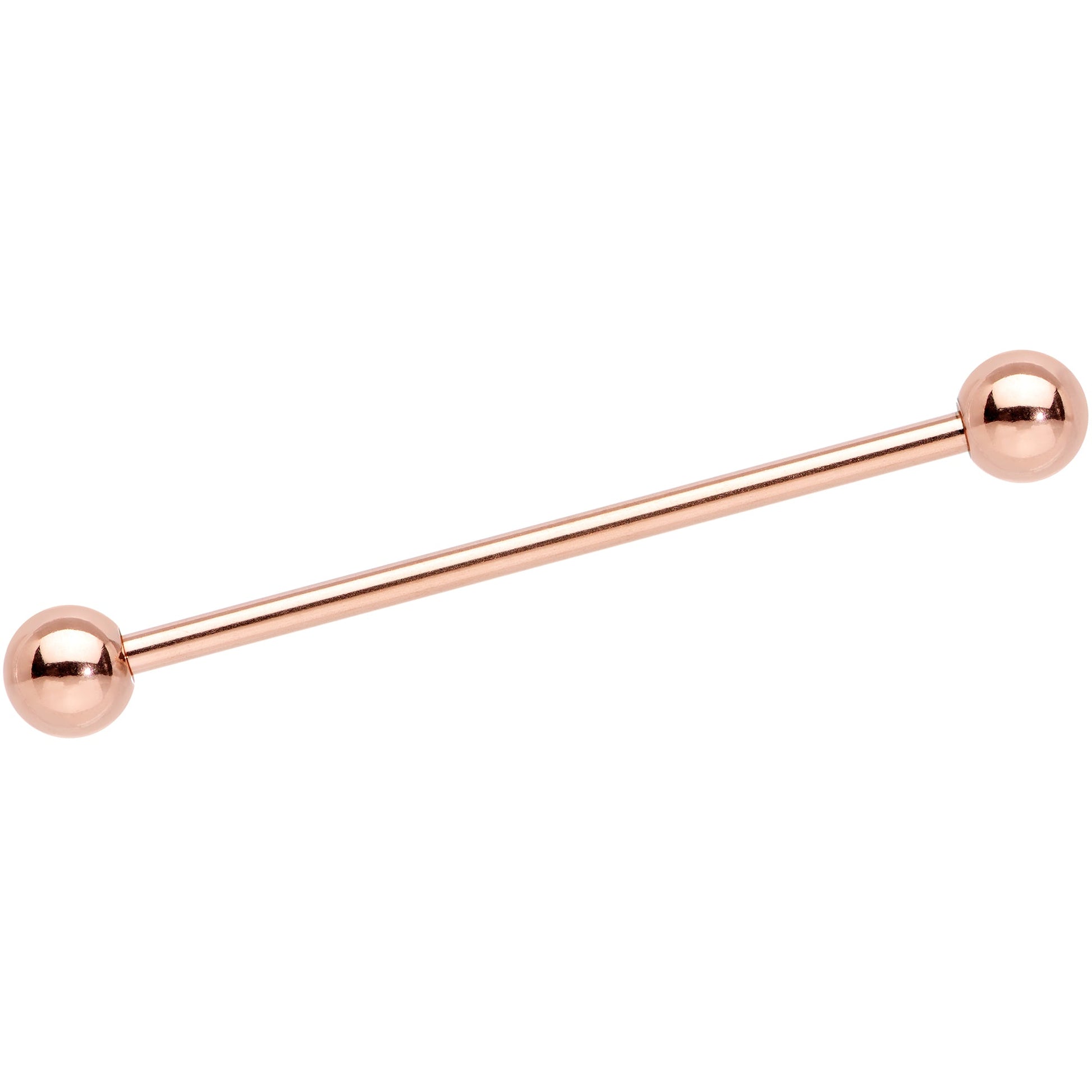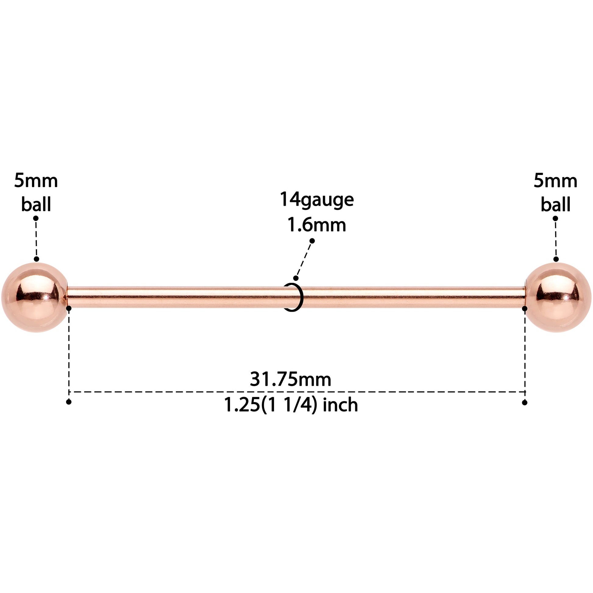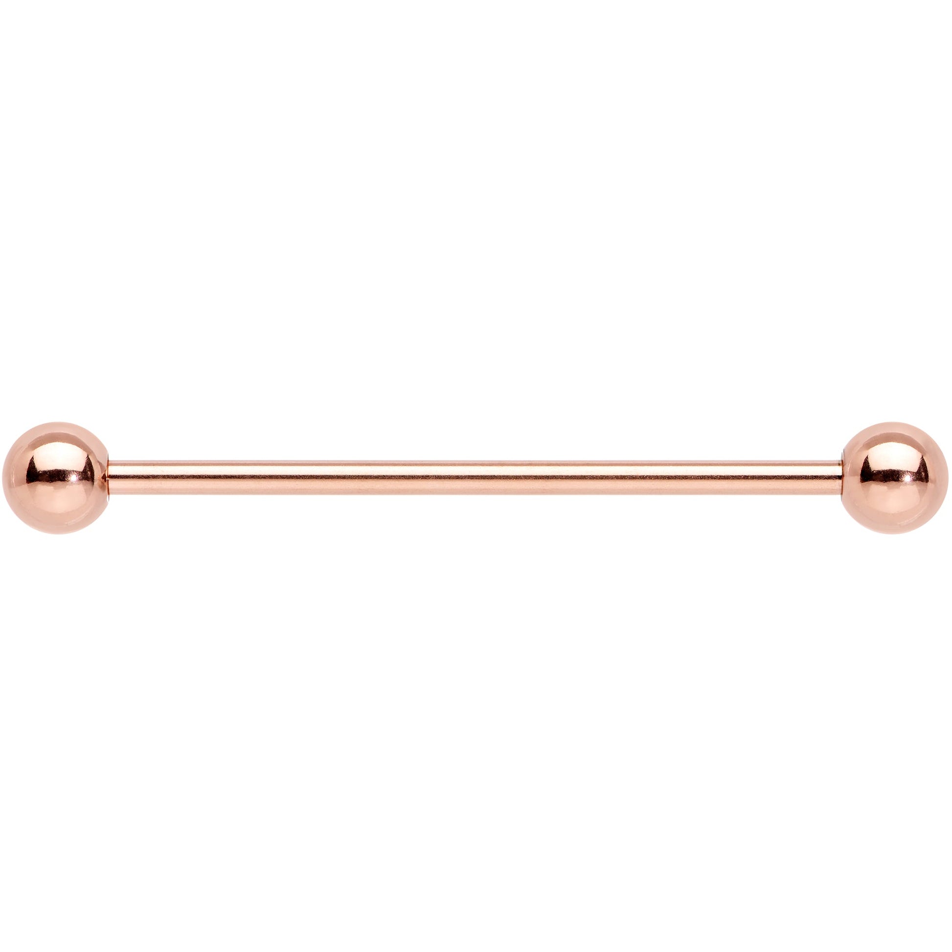 This 14 gauge 31.75mm straight barbell is a multipurpose piece that can be used for different types of piercings. 5mm ball ends and trendy rose gold make this classic industrial barbell a must-have for any lover of pierced Body Jewelry.