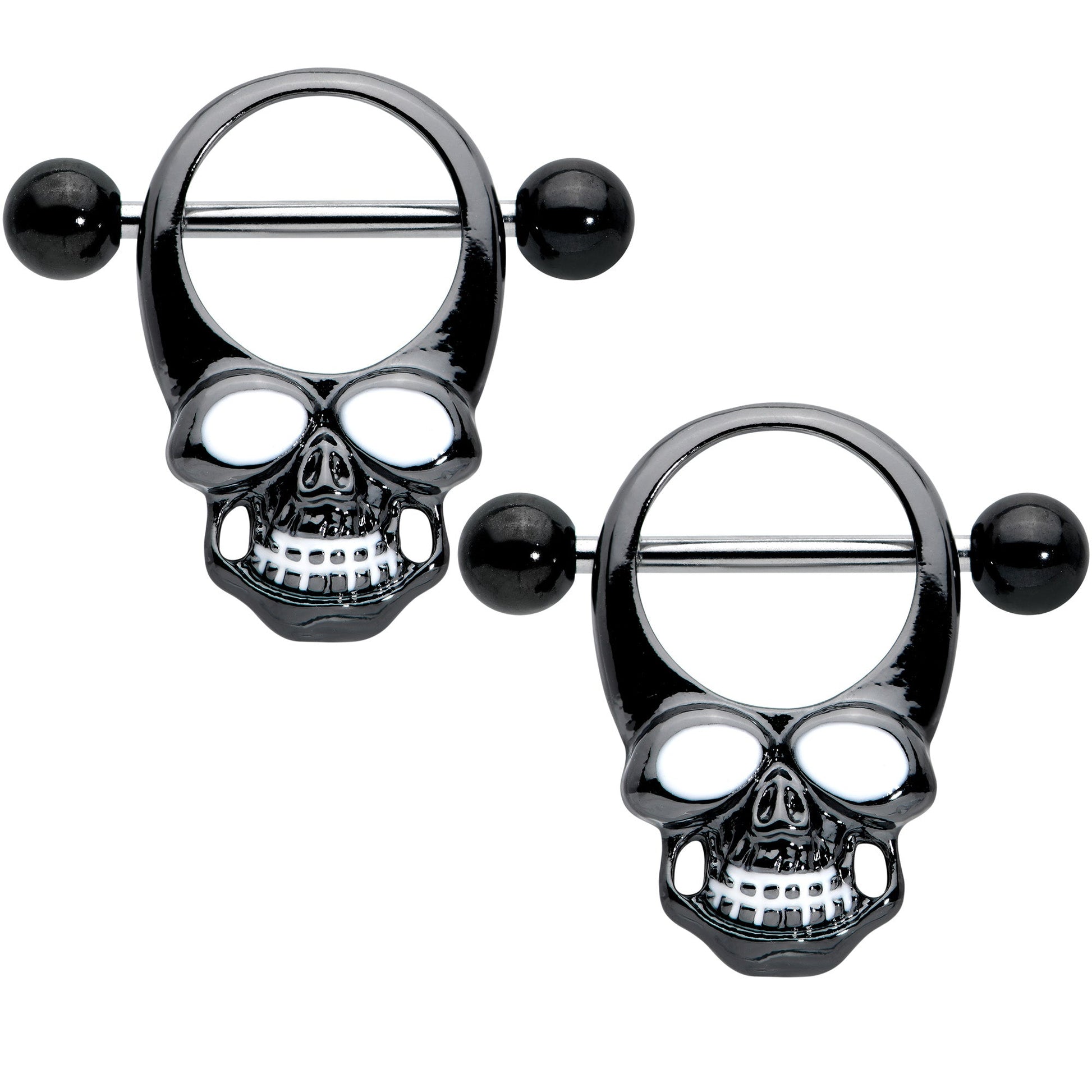 14G 1/2 Black Grinning Skull Nipple Shield Set