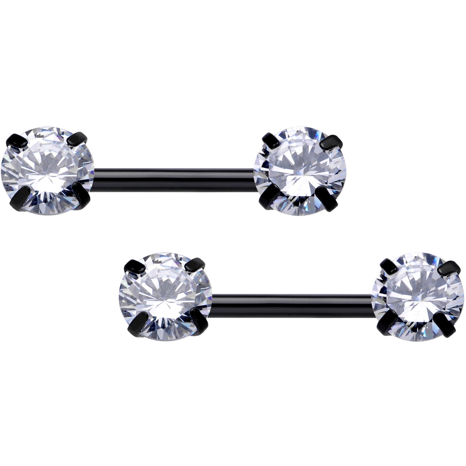 Add some sexy sophistication to your nipple piercings with this 14 gauge nipple jewelry! It's made with 12mm black PVD over 316L surgical grade stainless steel straight barbells. The charm ends are threadless round clear cubic zirconia gems made to make insertion and removal a breeze while still offering a secure fit. With their easy elegance and uncomplicated sophistication, these nipple piercing rings really do have it all! Sold as a set of two.Specifications