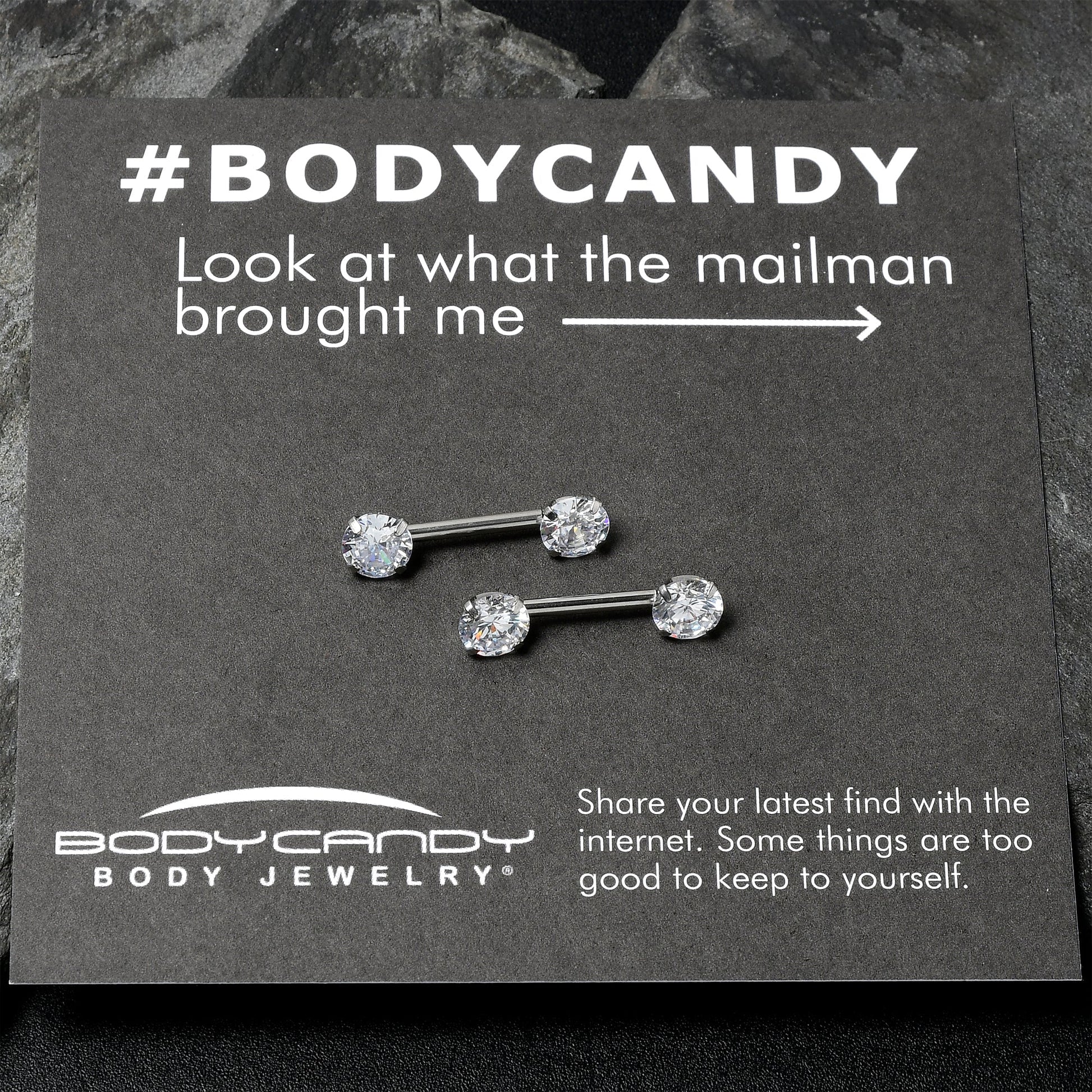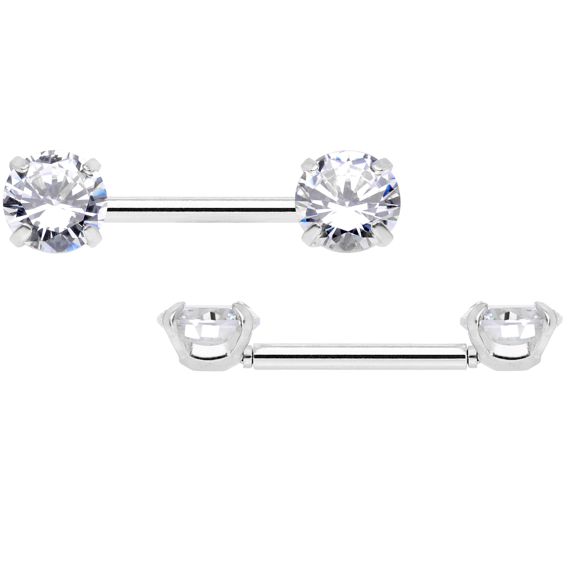 Add some sexy sophistication to your nipple piercings with this 14 gauge nipple jewelry! It's made with 12mm durable 316L surgical grade stainless steel straight barbells. The charm ends are threadless round clear cubic zirconia gems made to make insertion and removal a breeze while still offering a secure fit. With their easy elegance and uncomplicated sophistication, these nipple piercing rings really do have it all! Sold as a set of two.Specifications