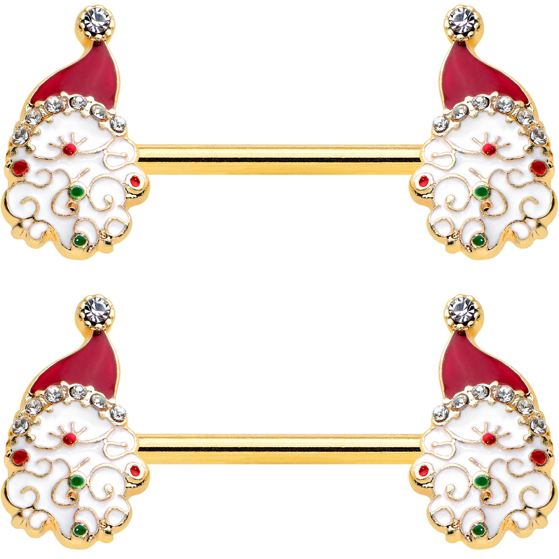 You'll be feeling as festive as Santa Claus when you're rocking this 14 gauge nipple jewelry! It's made with 12mm gold tone PVD over 316L surgical grade stainless steel straight barbells. Each of the ends features a Santa charm, embellished on his hat with clear gems. Each of Santa's beards feature red and green embellishments for an extra-festive holiday appearance. Party down in style this holiday season with these fabulous, festive, nipple piercing rings! Sold as a set of two.Specifications