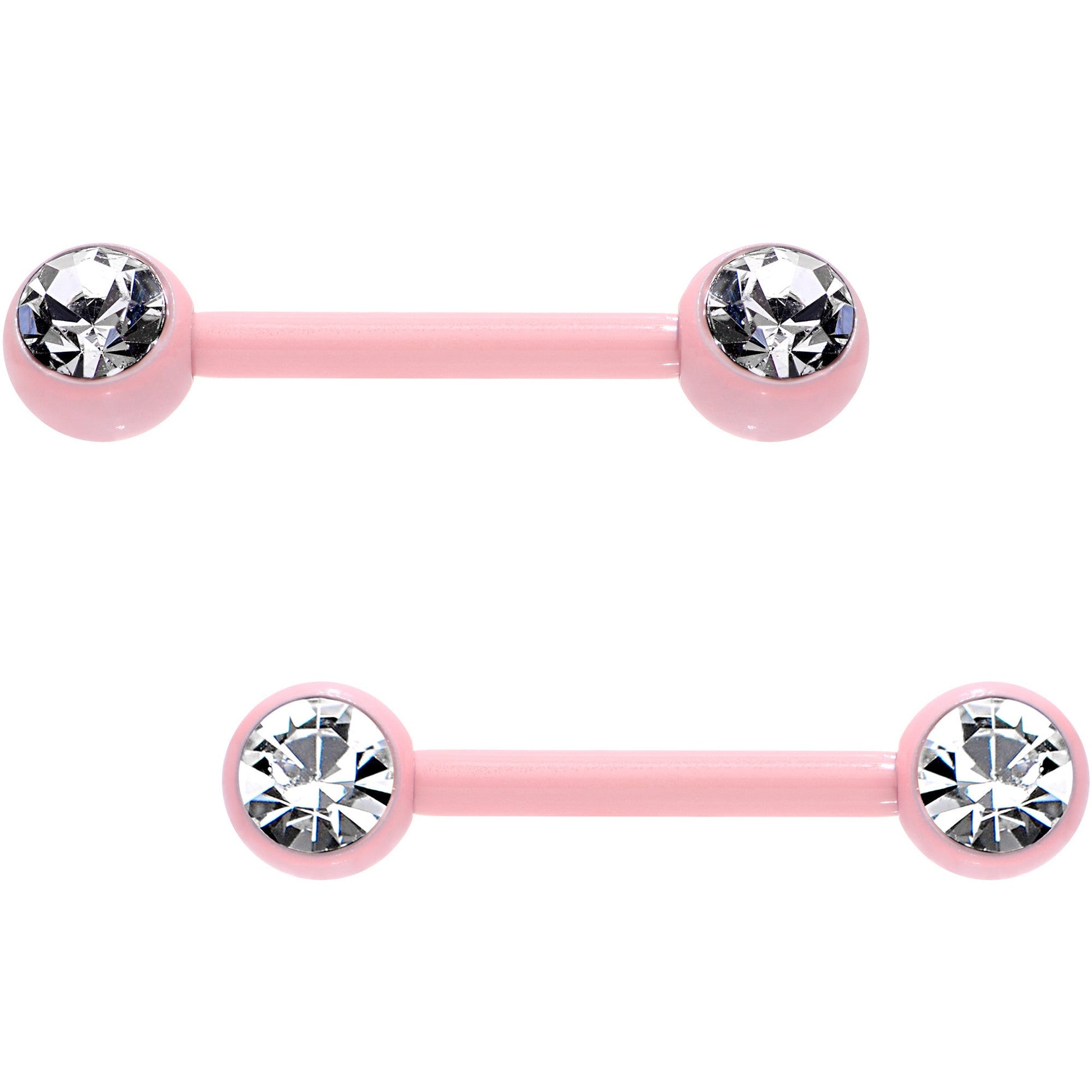 Express yourself to the fullest with this pair of colorful 14 gauge nipple rings! The 12mm length straight barbell used for both pieces are made from pink pastel ceramic coated over durable 316L surgical grade stainless steel. The forward-facing clear gems featured on the 5mm diameter ball ends provide you and your nipple piercings with some extra sparkle to make sure both of your breasts look their best in this set of 2 nipple bars.