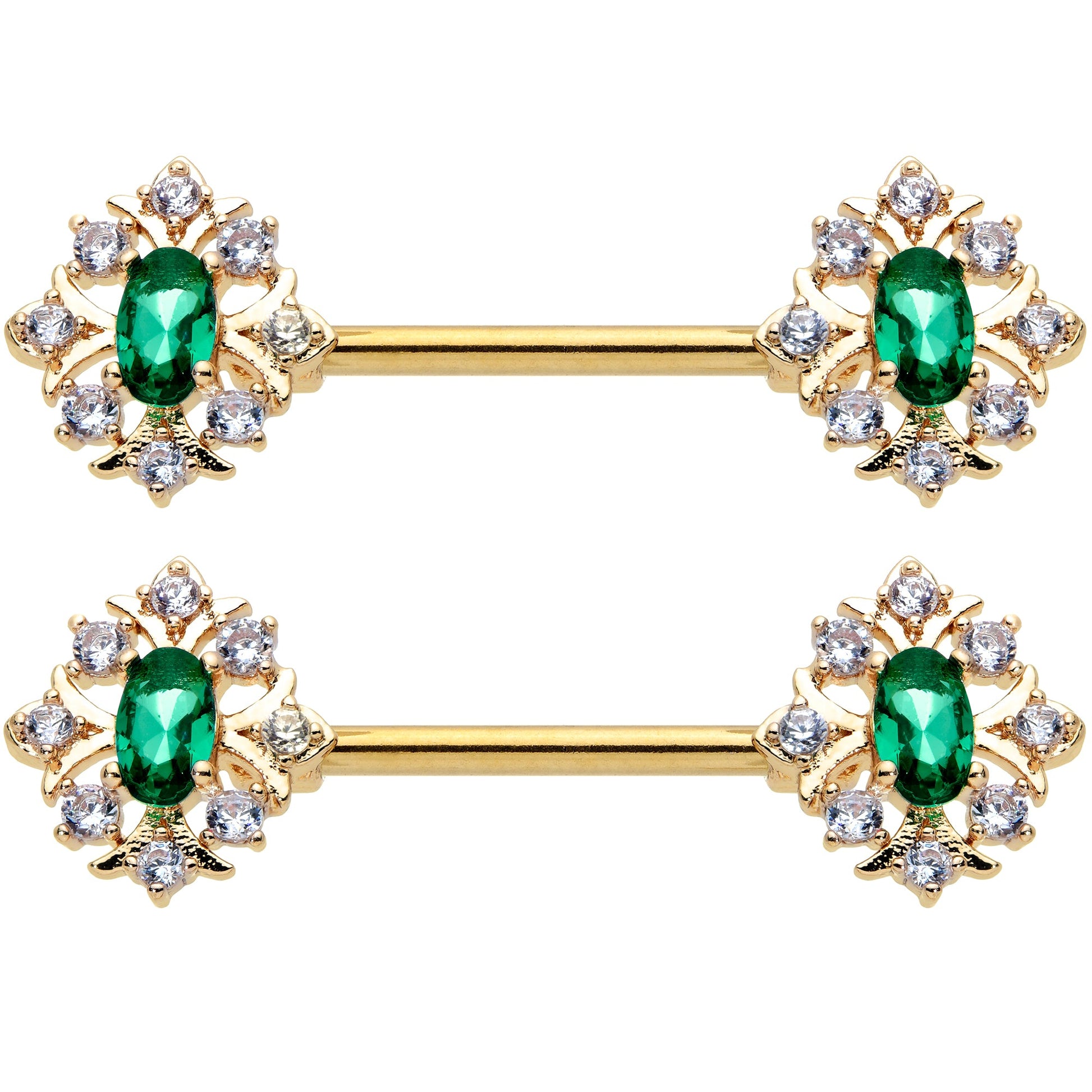 Take your nipple piercings back in time with this antique-inspired 14 gauge nipple jewelry! It's made with 12mm gold tone PVD over 316L surgical grade stainless steel straight barbells. Each of the ends features a large, oval green gem charm, set in a stylized rhombus that's embellished with clear gems for an elegantly retro appearance. Give an antique-inspired look to a modern piercing with this Art Deco styled nipple piercing jewelry! Sold as a set of two.Specifications