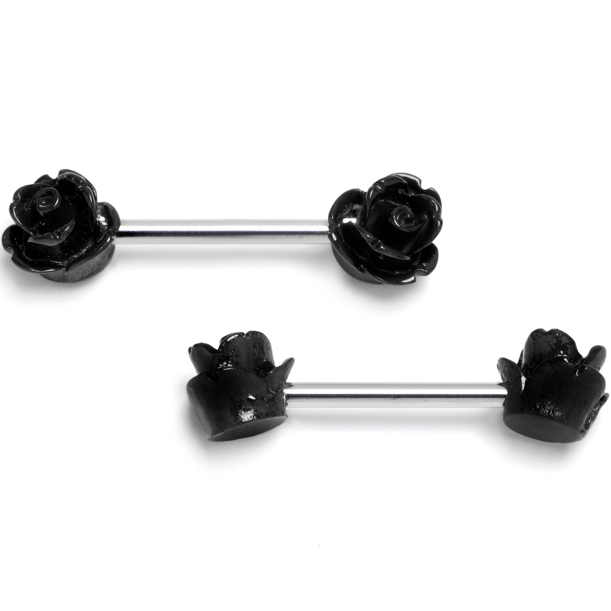 14G 1/2 Open Bloom Rose Black Barbell Nipple Ring Set