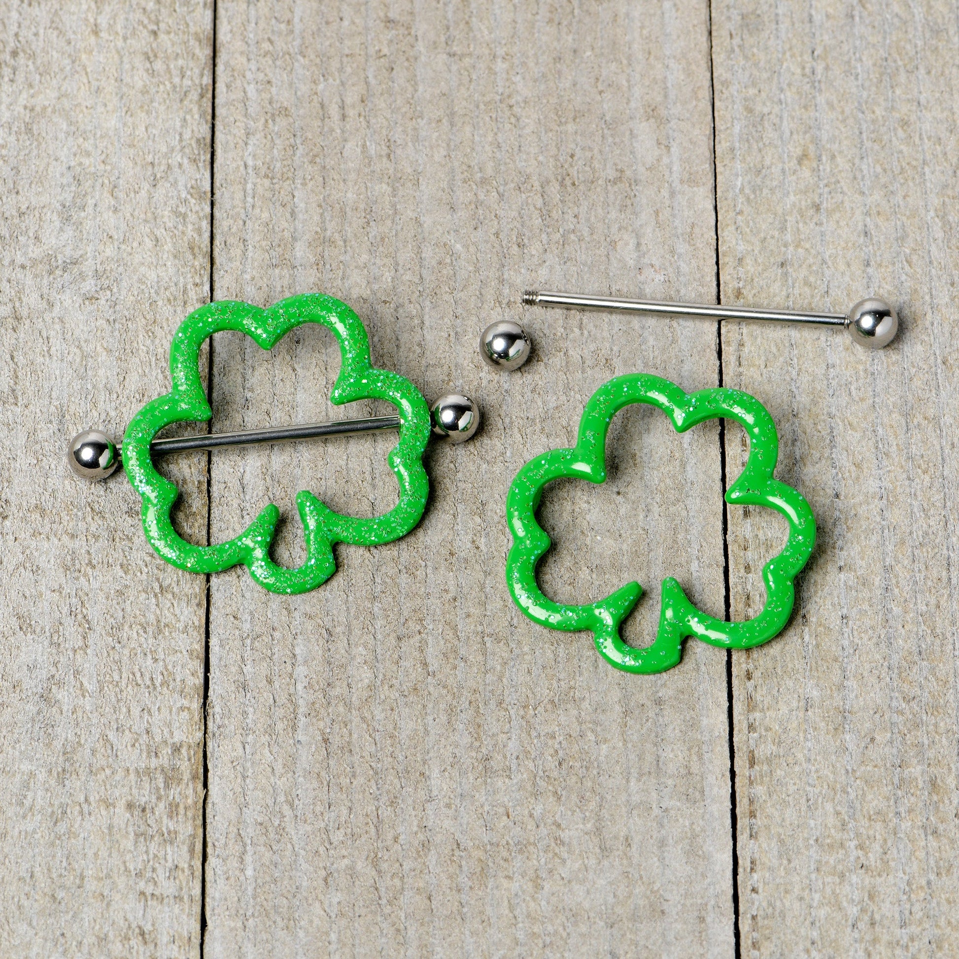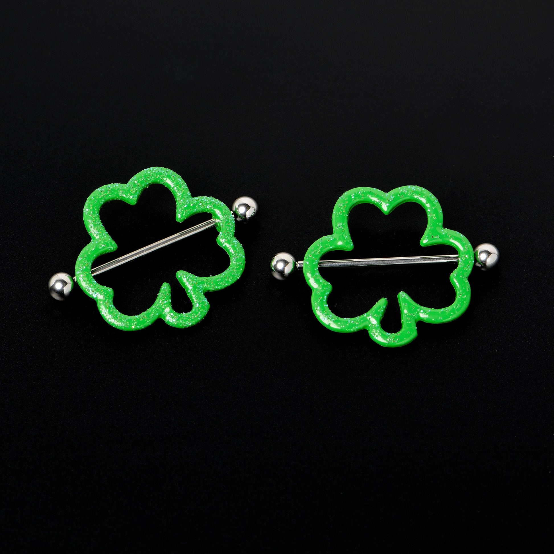 Get lucky for St Patrick's Day with this 14 gauge nipple jewelry! It's made with 30mm durable 316L surgical grade stainless steel straight barbells with 5mm ball ends. It features green shamrock shields, with open interiors for maximum comfort. The bright green color and unmistakable shamrock shape make for a whimsical and visually striking effect. You won't be able to help getting lucky when you're rocking these Saint Patrick's Day nipple piercing rings! Sold as a set of two.Specifications