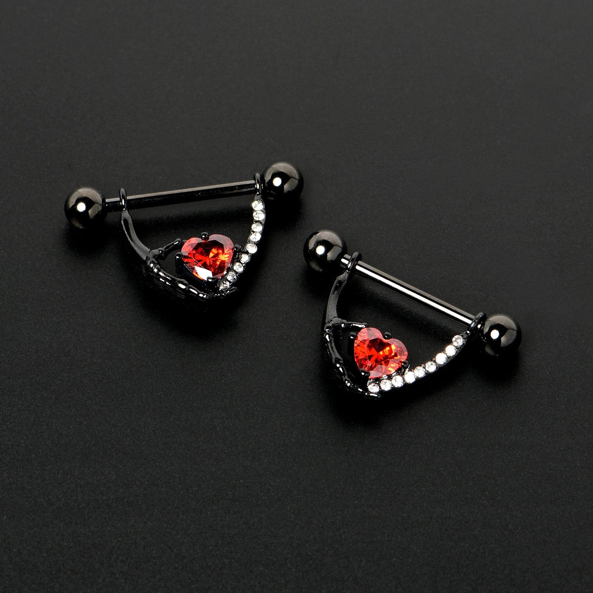 Nobody will dare steal your heart away when it's protected by the claw hand on this 14 gauge nipple jewelry! It's made with 18mm black PVD over 316L surgical grade stainless steel straight barbells with 5mm ball ends. The dangling portion features one side that curves down on an elegant swoop, and is set with clear cubic zirconia gems. The other side features an arm ending in a fearsome claw and holding a heart shaped red cubic zirconia gem. Give your heart to gothic elegance with these eye catching nipple piercing rings! Sold as a pair of two.Specifications