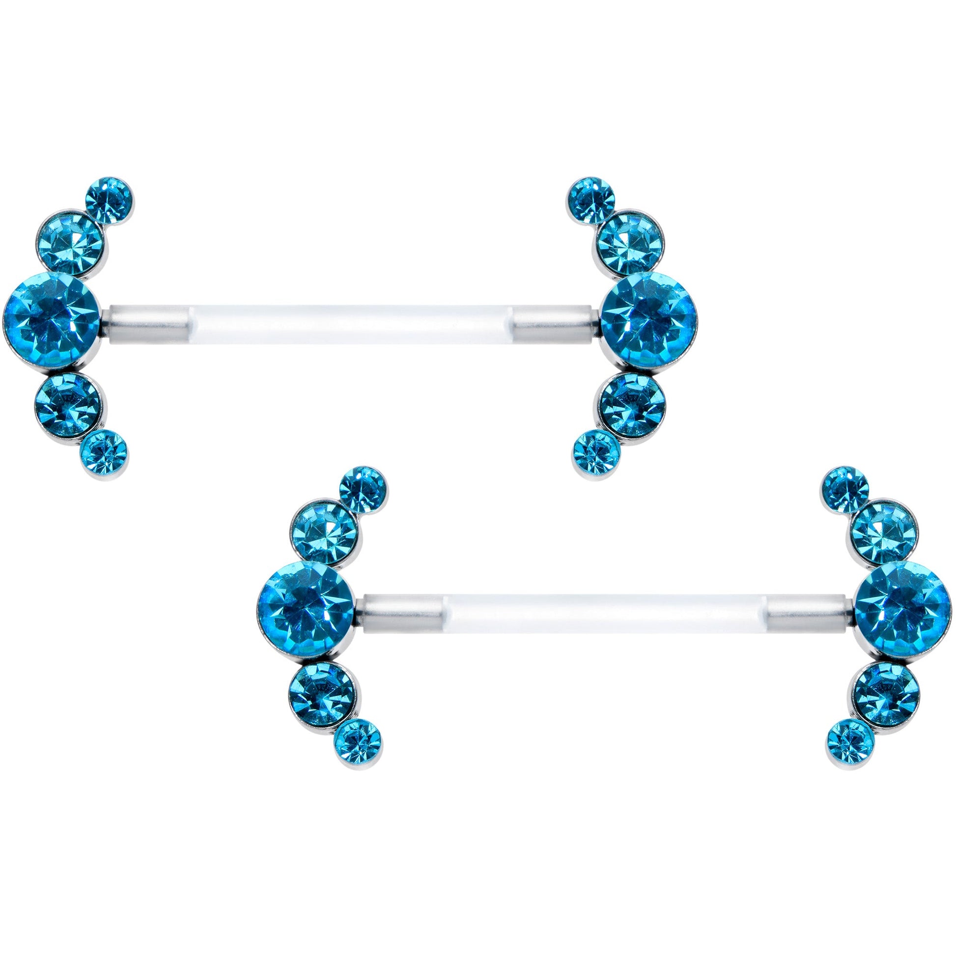 Whether you're looking for a more subtle look or you just want to up your comfort level, you're all set with this 14 gauge nipple jewelry. It's made with 20mm flexible Bioplast straight barbells and features eye-catching blue gem charm ends that will always have your nipple piercings looking on point! The ends feature a gently curved design with five round, blue gems for extra glamour. This nipple piercing jewelry is more than ready to make its way into your pierced nipples for a style that will bring low-maintenance glamour to any situation. Sold as a set of two.Specifications