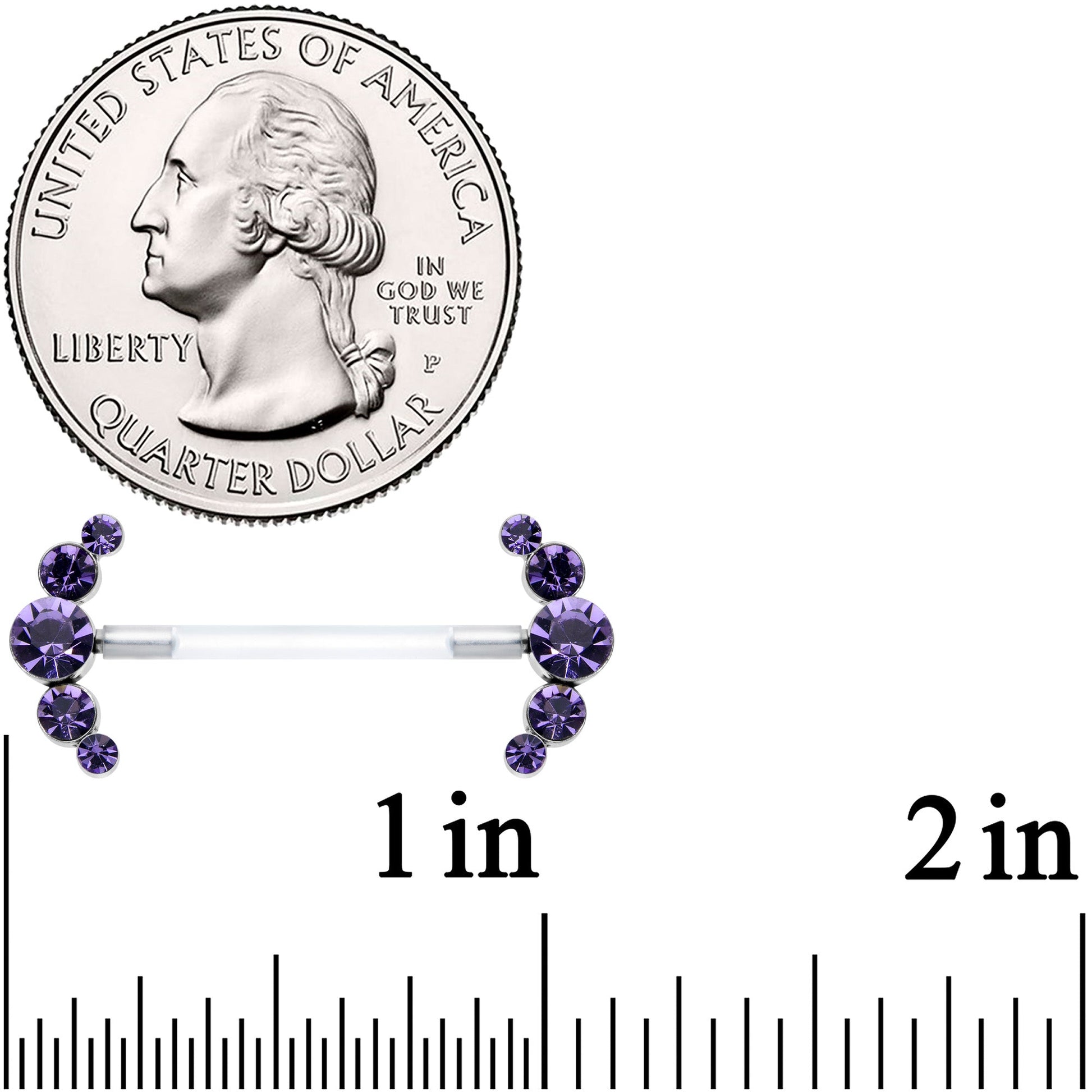 Whether you're looking for a more subtle look or you just want to up your comfort level, you're all set with this 14 gauge nipple jewelry. It's made with 20mm flexible Bioplast straight barbells and features eye-catching purple gem charm ends that will always have your nipple piercings looking on point! The ends feature a gently curved design with five round, purple gems for extra glamour. This nipple piercing jewelry is more than ready to make its way into your pierced nipples for a style that will bring low-maintenance glamour to any situation. Sold as a set of two.Specifications