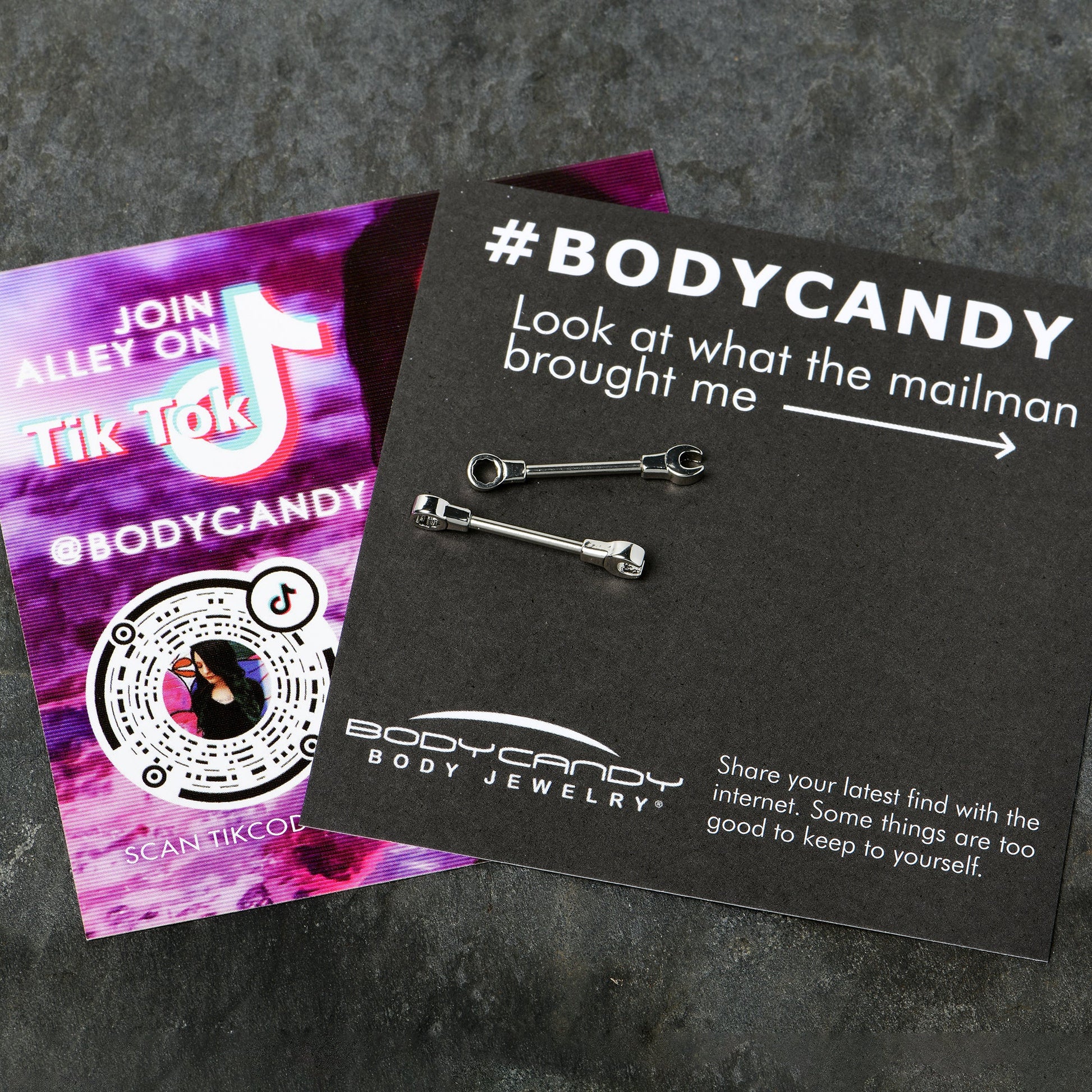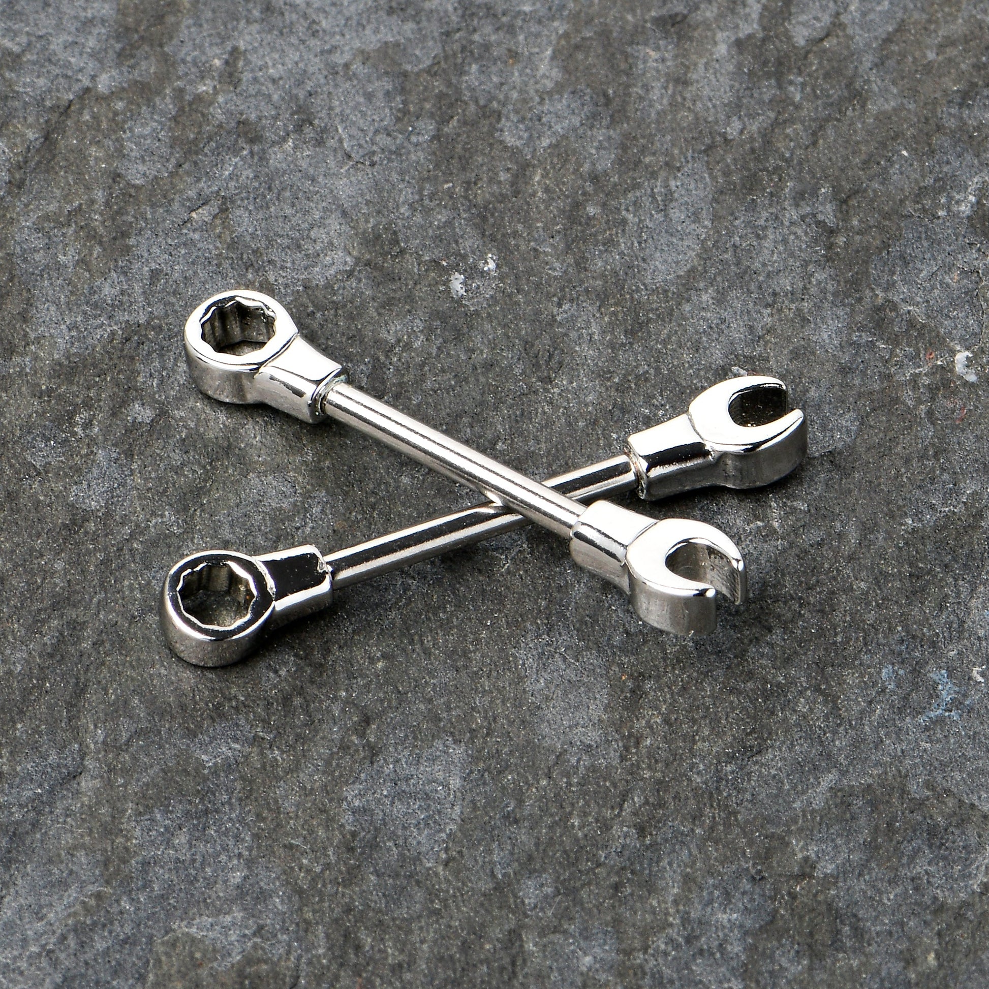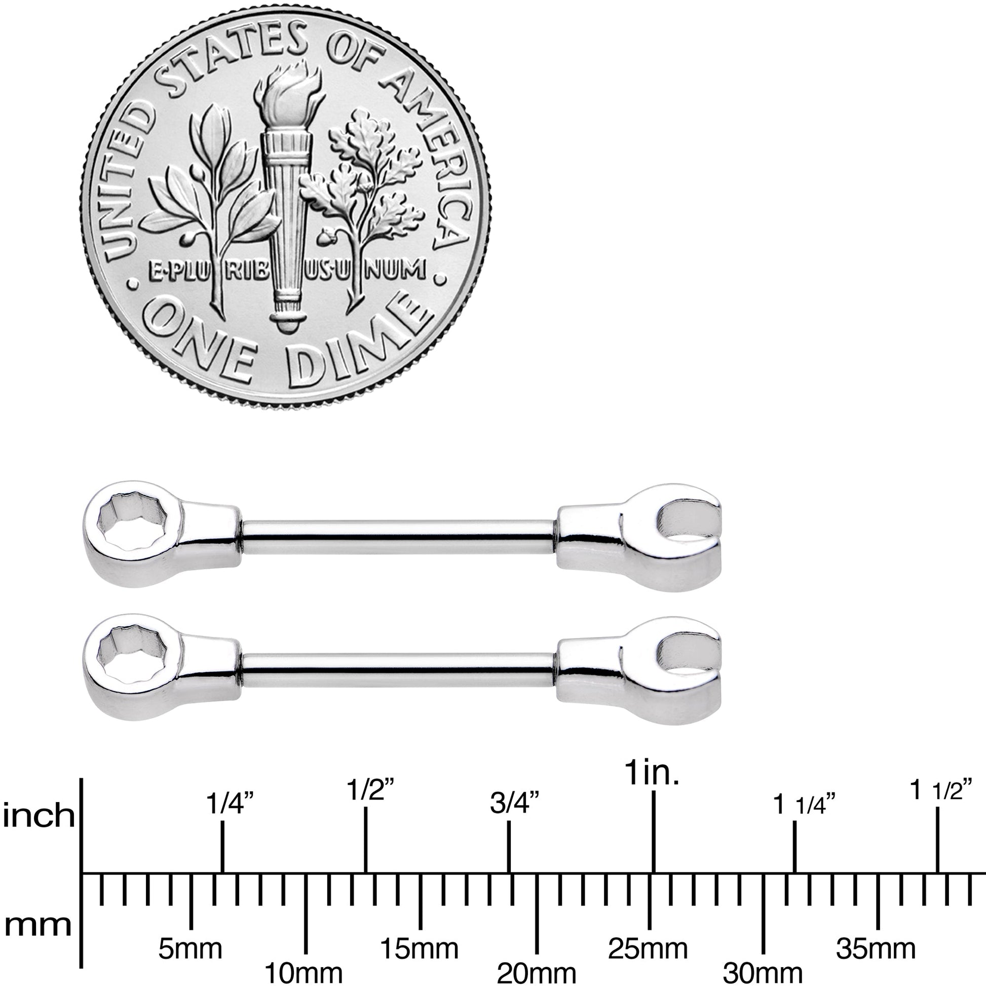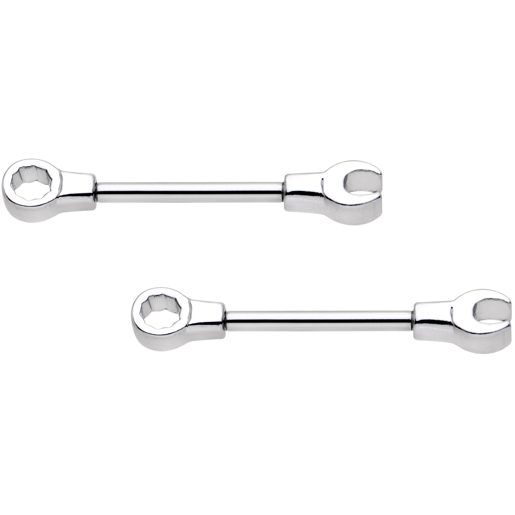 Unleash your inner grease monkey and show your love for all this mechanical with these cute 14 gauge combo wrench nipple piercings! Made with 13mm durable 316L surgical grade stainless steel straight barbells, this set of nipple jewelry features an open ended spanner wrench on one side and a ring spanner wrench on the other. This bold set of nipple barbells is sold as a set of two.
