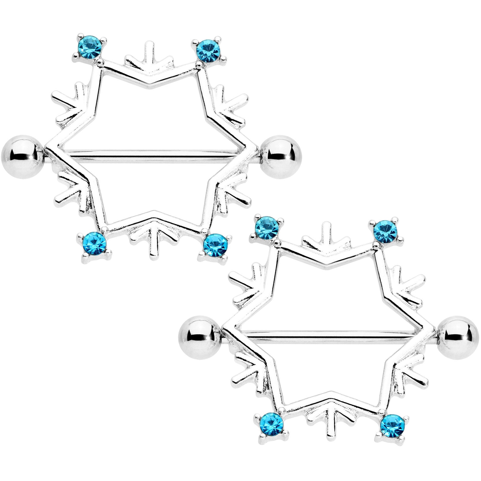 Why let the snowflakes fall when you can wear them with this 14 gauge nipple jewelry? It's made with 19mm wearable length 316L surgical grade stainless steel straight barbells with 5mm ball ends. The shield portions elegantly understated, with a stylized shape and minimalist detailing. The points of the snowflakes are set with aqua gems to ensure that minimalist never means mundane! Let your nipple piercings look simply spectacular with these straightforward snowflake nipple shields! Sold as a set of two.Specifications
