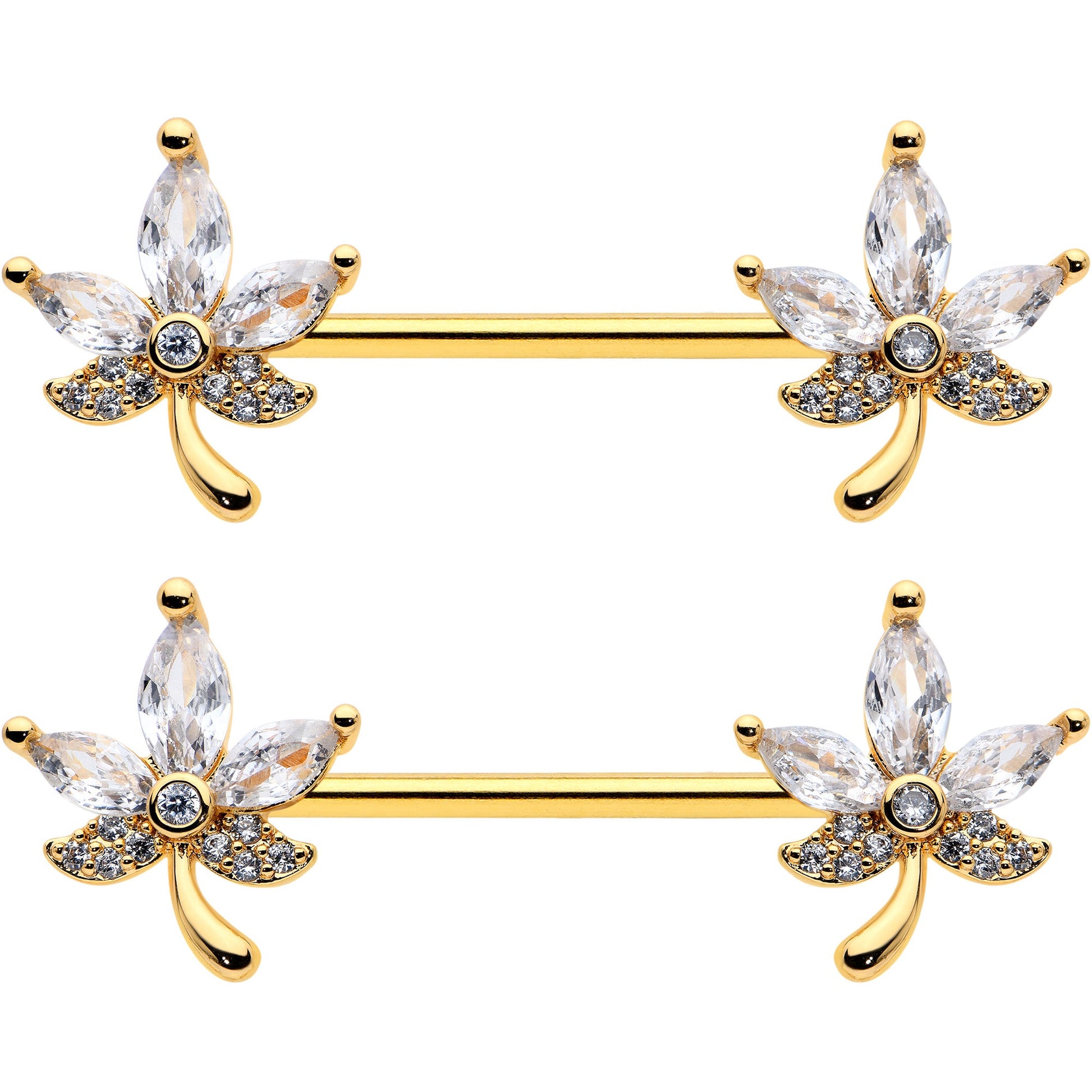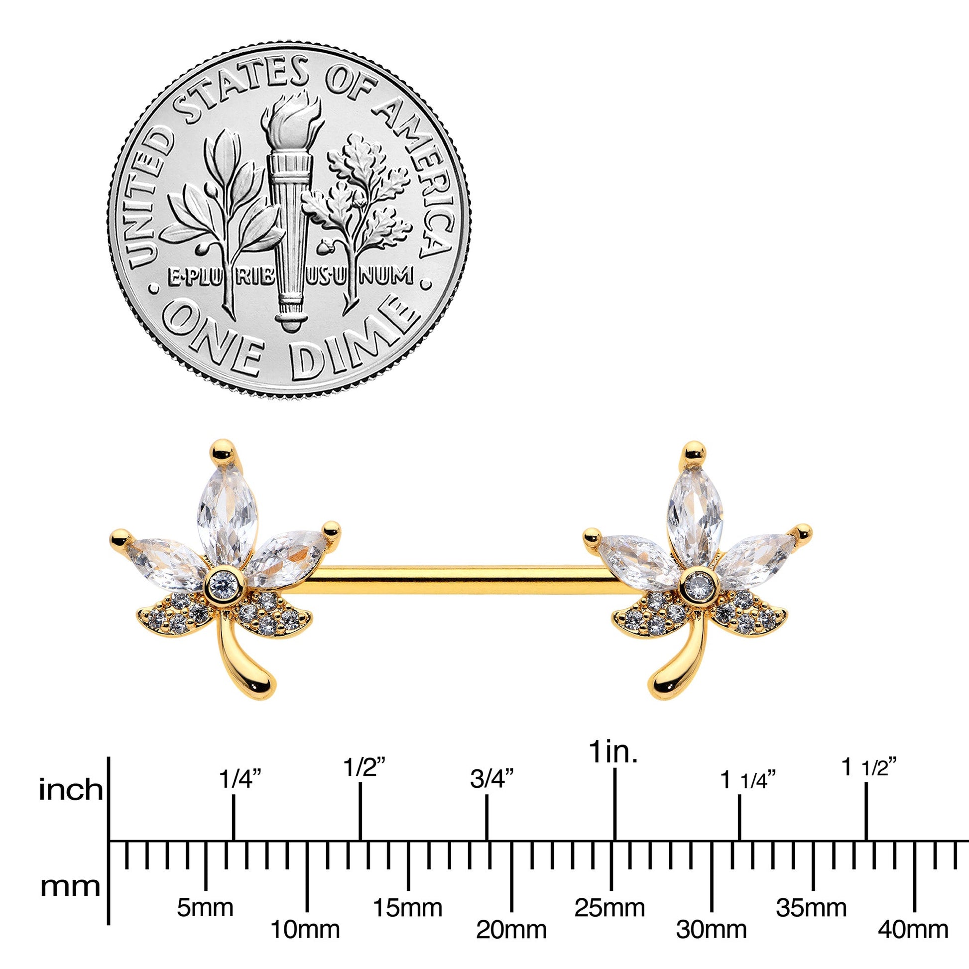 14G 3/4 Clear CZ Gem Gold Tone Pot Leaf Barbell Nipple Ring Set