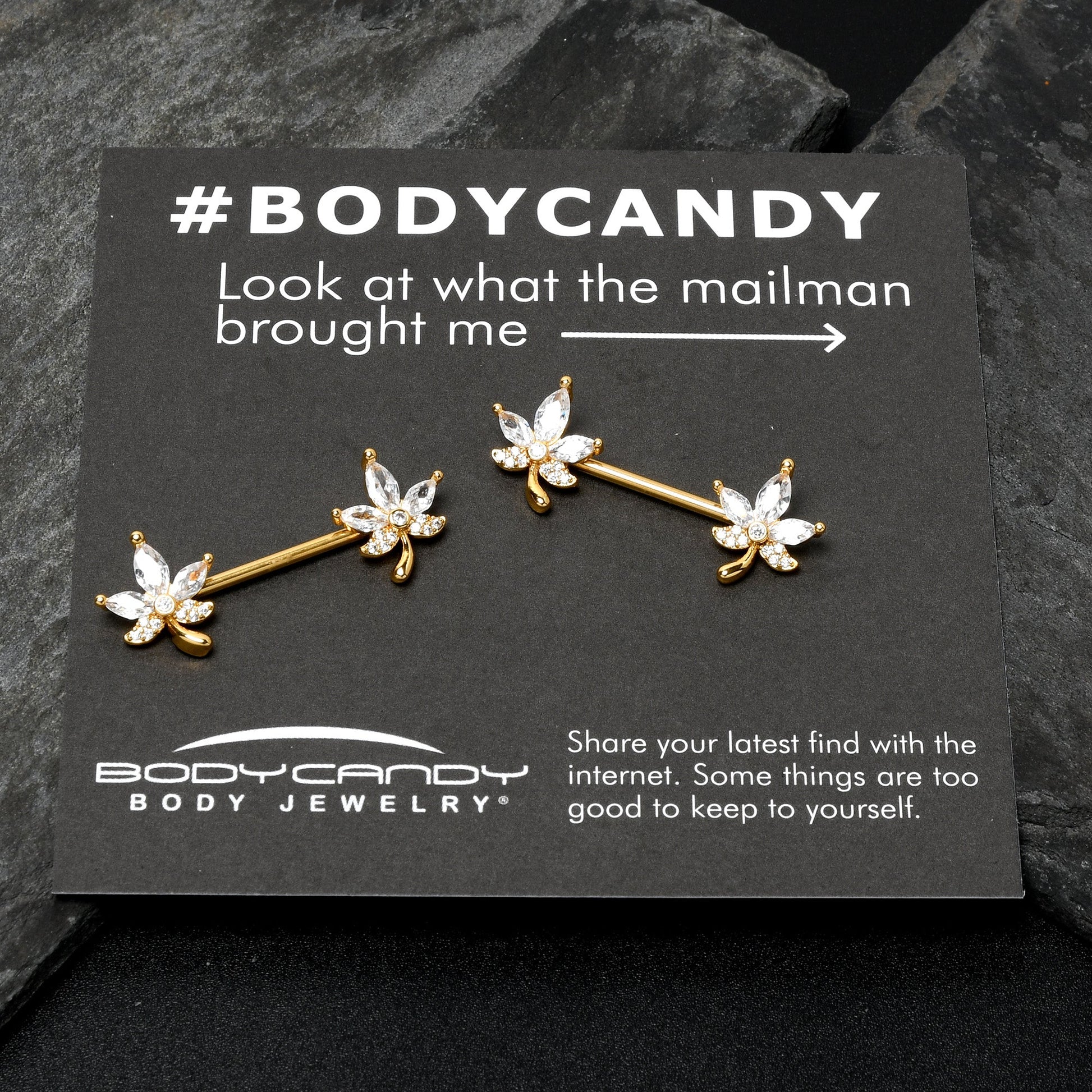 14 Gauge 3/4 Clear CZ Gem Gold Tone Pot Leaf Barbell Nipple Ring Set