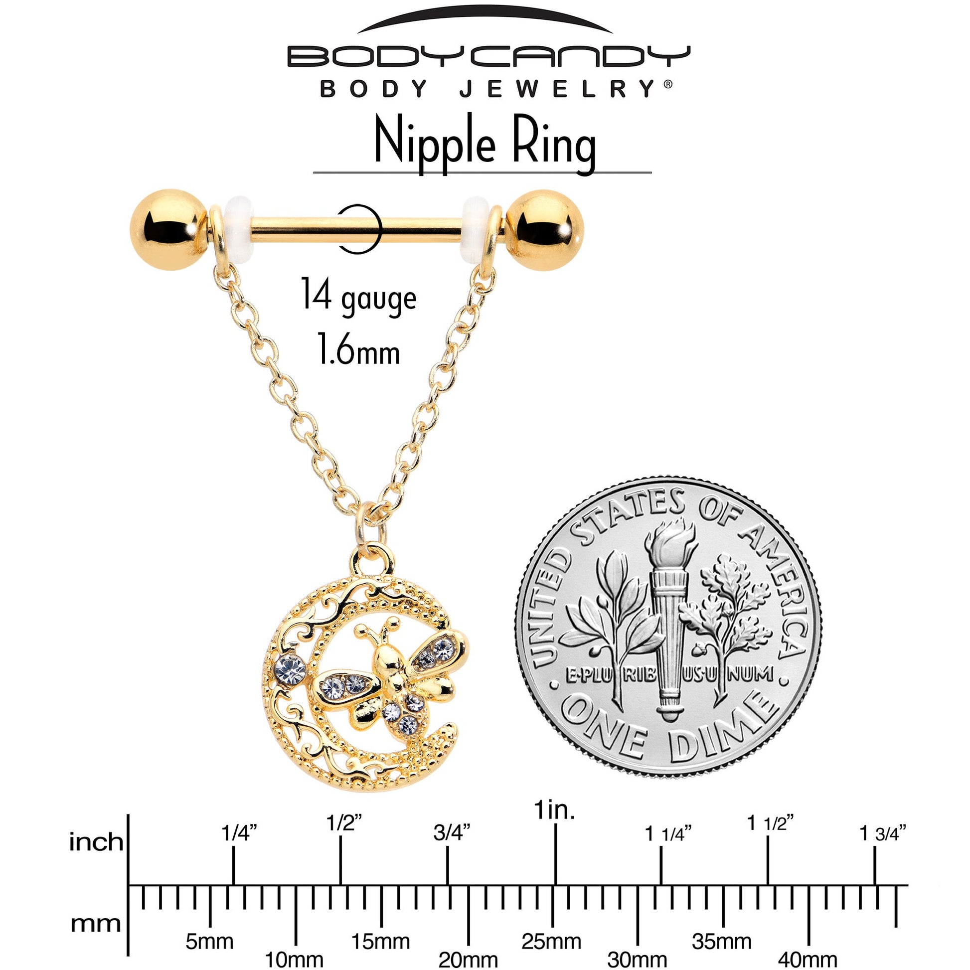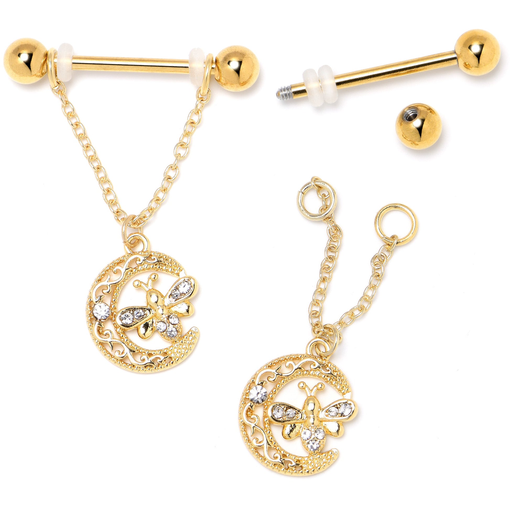 This crescent moon may be alone in the sky but it's got a friend on this 14 gauge nipple jewelry. It is made with 19mm gold tone plated over 316L surgical grade stainless steel straight barbells with 5mm ball ends. Each barbell supports a matching length of dangling chain. Each chain features a crescent moon charm, embellished with filigree detailing giving them an airy appearance as well as clear gem embellishments. Set between the points of the moons are dragonfly charms, with clear gems in the wings and bodies. You'll want these nipple piercing rings to keep you company forever. Sold as a set of two.Specifications