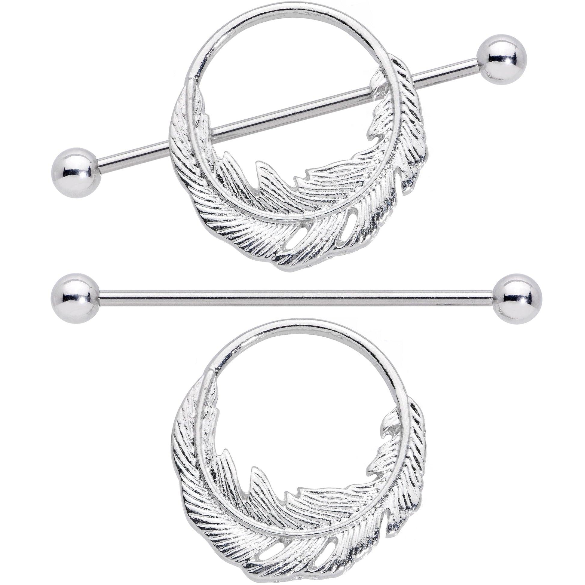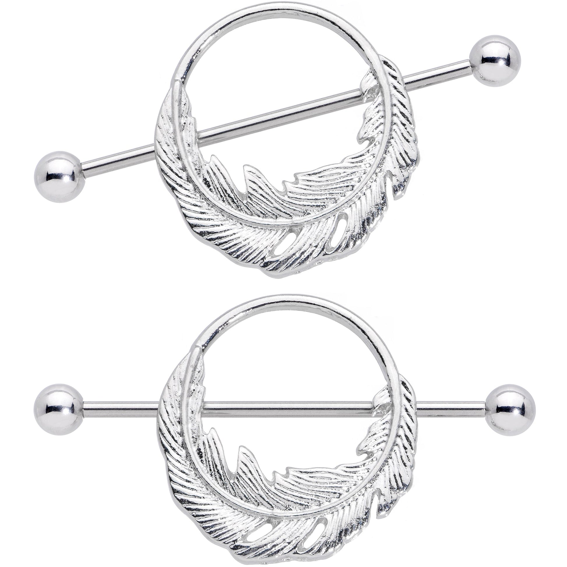 The feather on this 14 gauge nipple jewelry seems to be drifting gracefully through the air. It's made with 19mm wearable length 316L surgical grade stainless steel straight barbells with 5mm ball ends. The total length of the barbells is 1 1/2" and the shield has a 5/8" rise. The shield portion features a feather on the lower half, curving upwards. It's embellished with textured detailing for a more realistic appearance and added style. Let your style soar with these fabulous feather-themed nipple shields! Sold as a set of two.Specifications