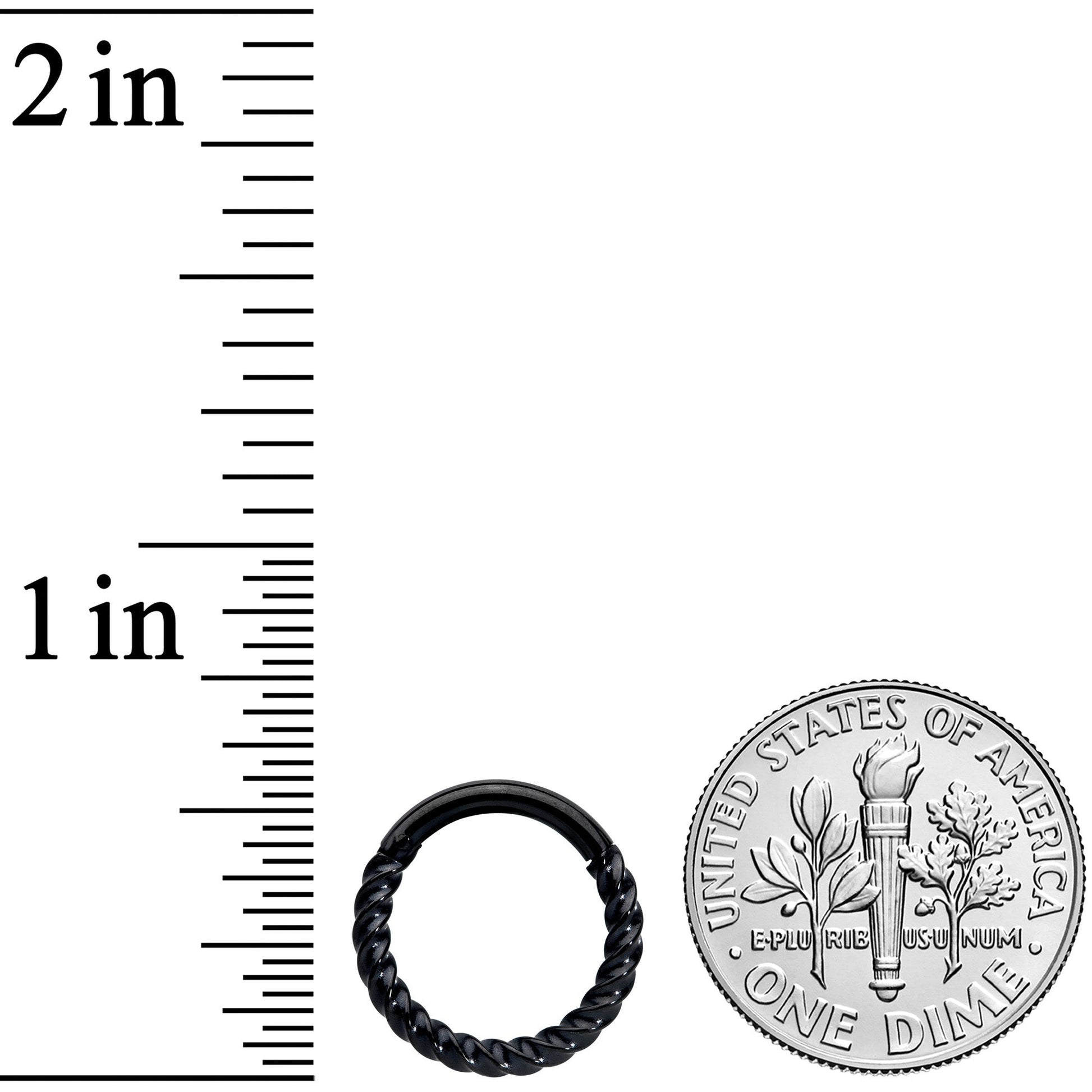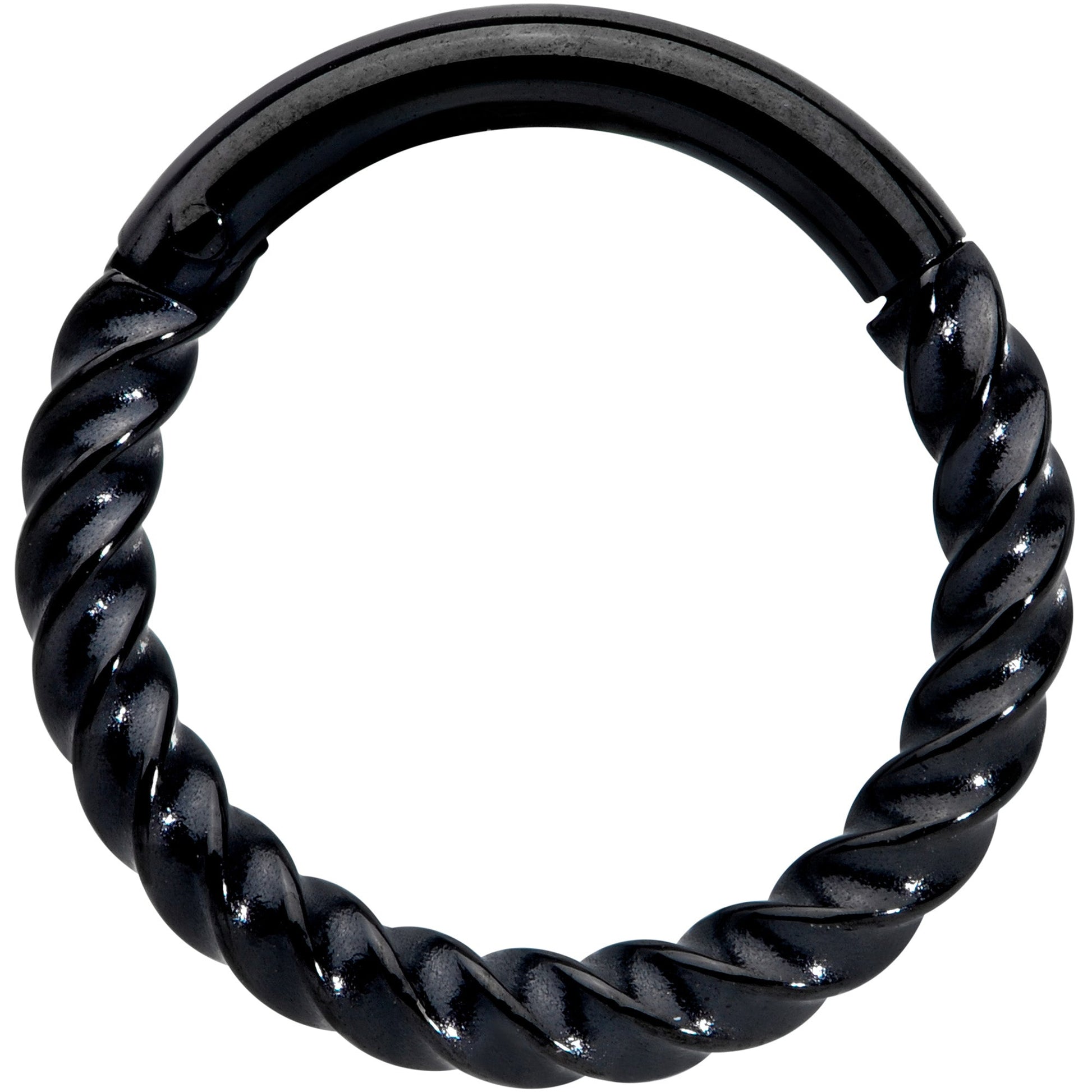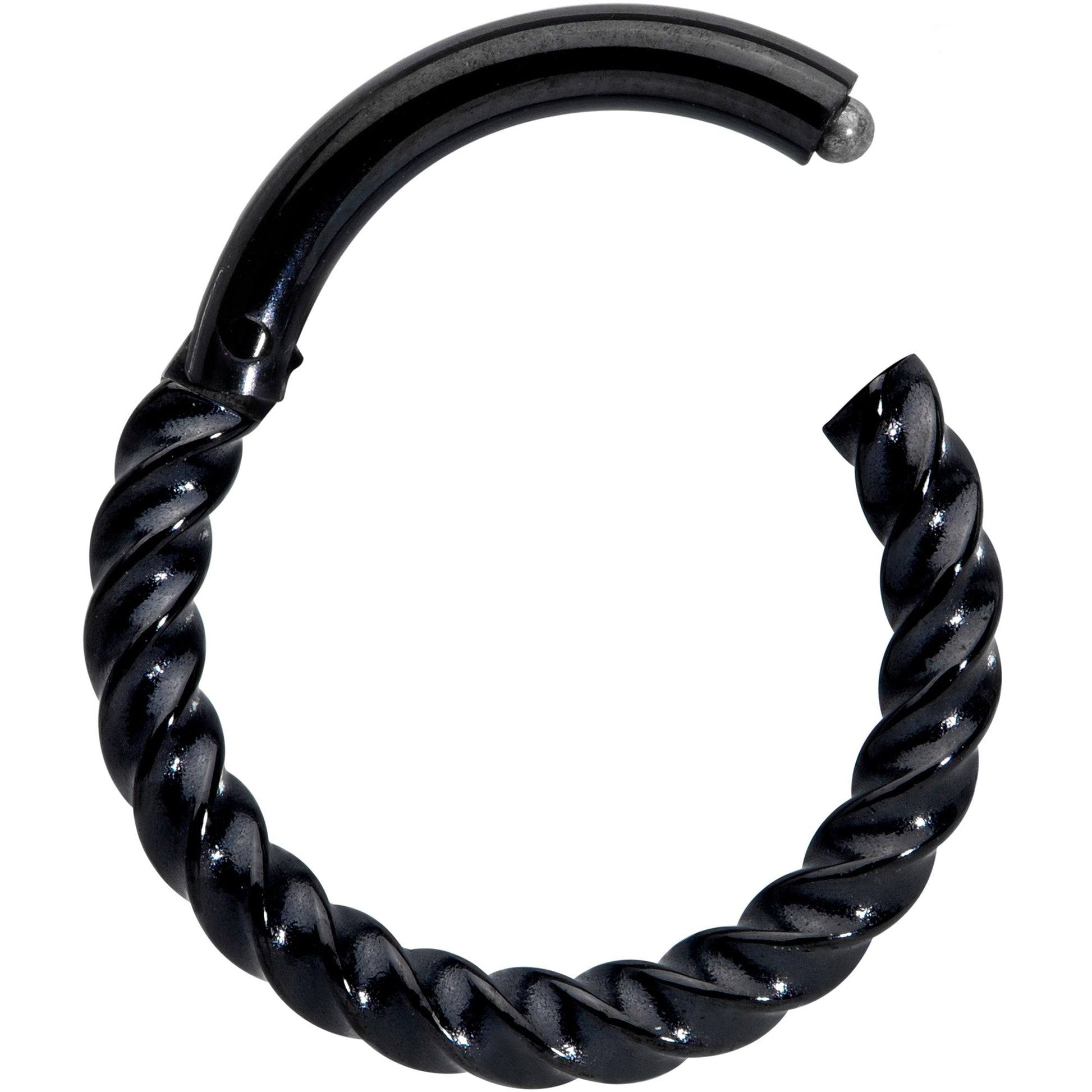 Add some twisted style to your septum piercings with this 14 gauge clicker ring! It's made with a 10mm black PVD over 316L surgical grade stainless steel hinged curved barbell. It features a simple but striking twisted design that's basic but never boring. You'll love how the clicker design makes it super easy to insert and remove and you can wear it in multiple piercings including septum, stretched lobes, and some lip piercings! Now that's a twist you're sure to love!Specifications