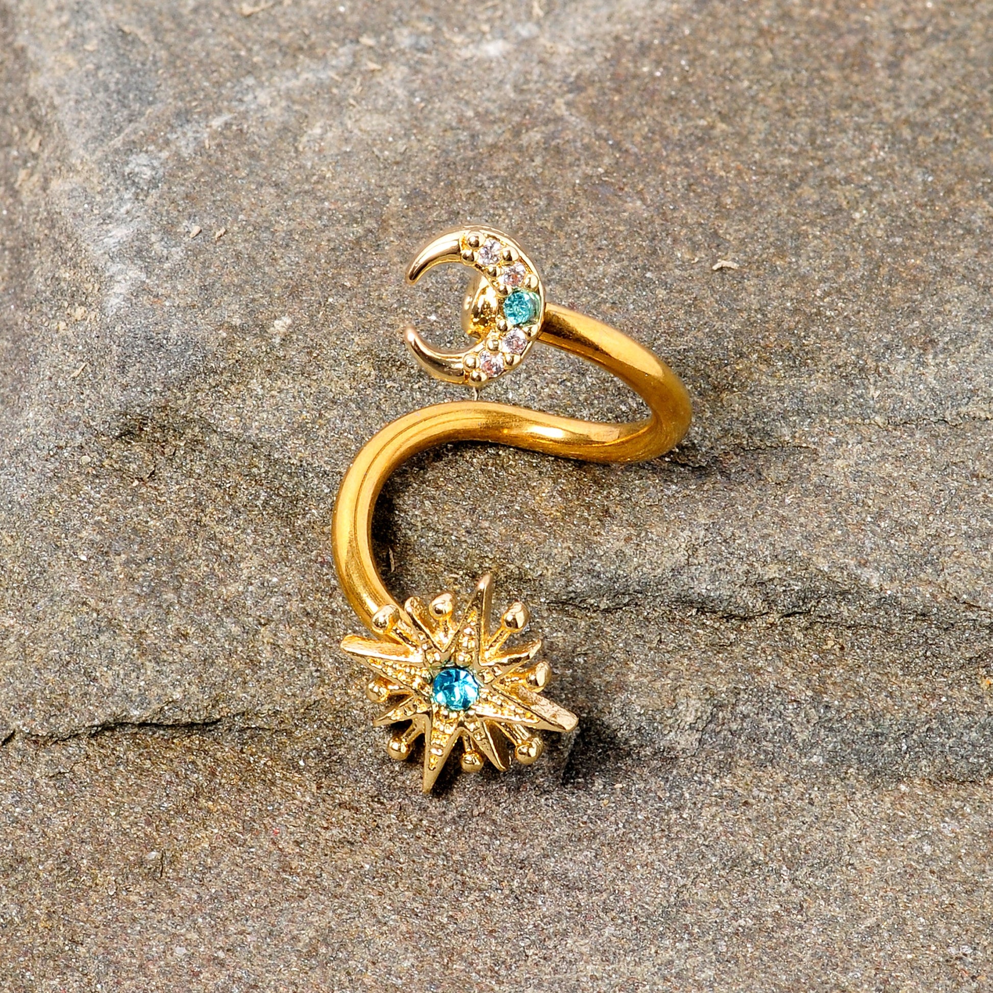 This 14 gauge spiral ring isn't just any piece of body jewelry....it's body jewelry with a twist! It's made with a 10mm gold tone PVD over 316L surgical grade stainless steel spiral curved barbell. One end features a petite crescent moon charm set with clear gems and a single blue gem. The other end features a multi-pointed star charm with a matching blue gem at the center for more of that stunning color contrast. Best of all, this style of body jewelry works well in multiple piercings including your navel, eyebrow, lip, and some cartilage piercings like your helix too! So let your piercings get twisted with this gorgeous celestial twister ring!Specifications