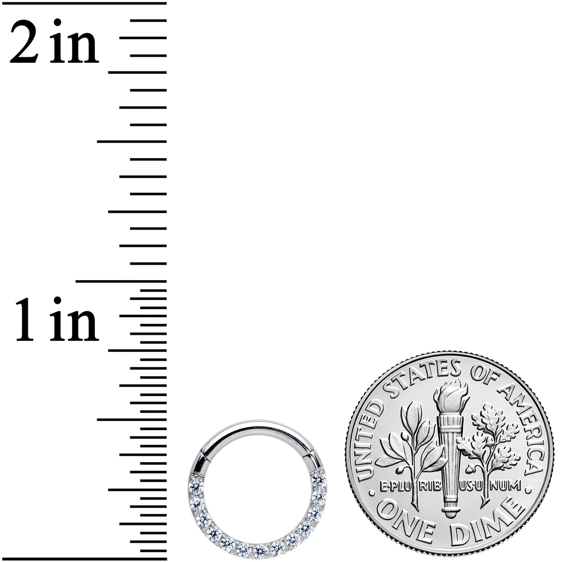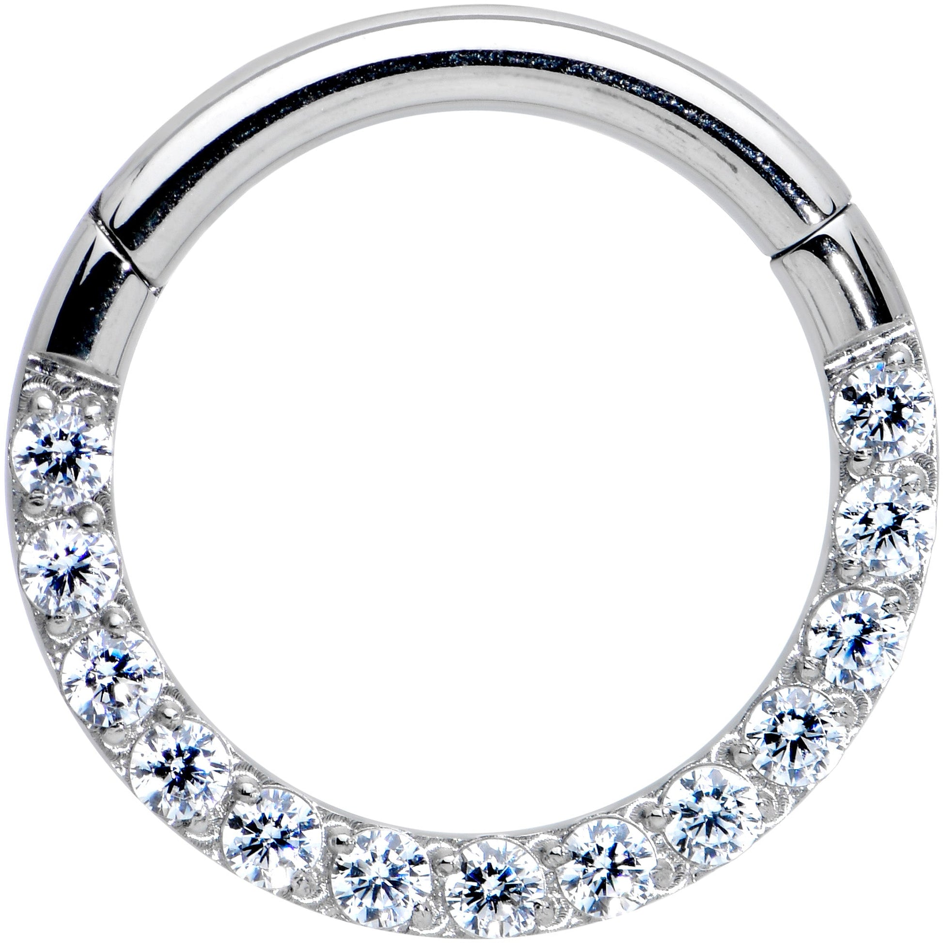 Add a look of sophistication to your cartilage piercings with this 14 gauge septum ring! It's made with a 10mm solid grade 23 implant grade titanium hinged circular ring. The bottom arc of this cartilage earring is paved with clear cubic zirconia gems for a look that's totally attention-getting without being over-the-top. It also features a hinged, non-removable segment that makes insertion and removal a snap and it works well in multiple piercings including larger-gauge tragus, helix, and septum piercings. So why be subtle when you can be ultra-glam with this fabulously extravagant cartilage ring?Specifications