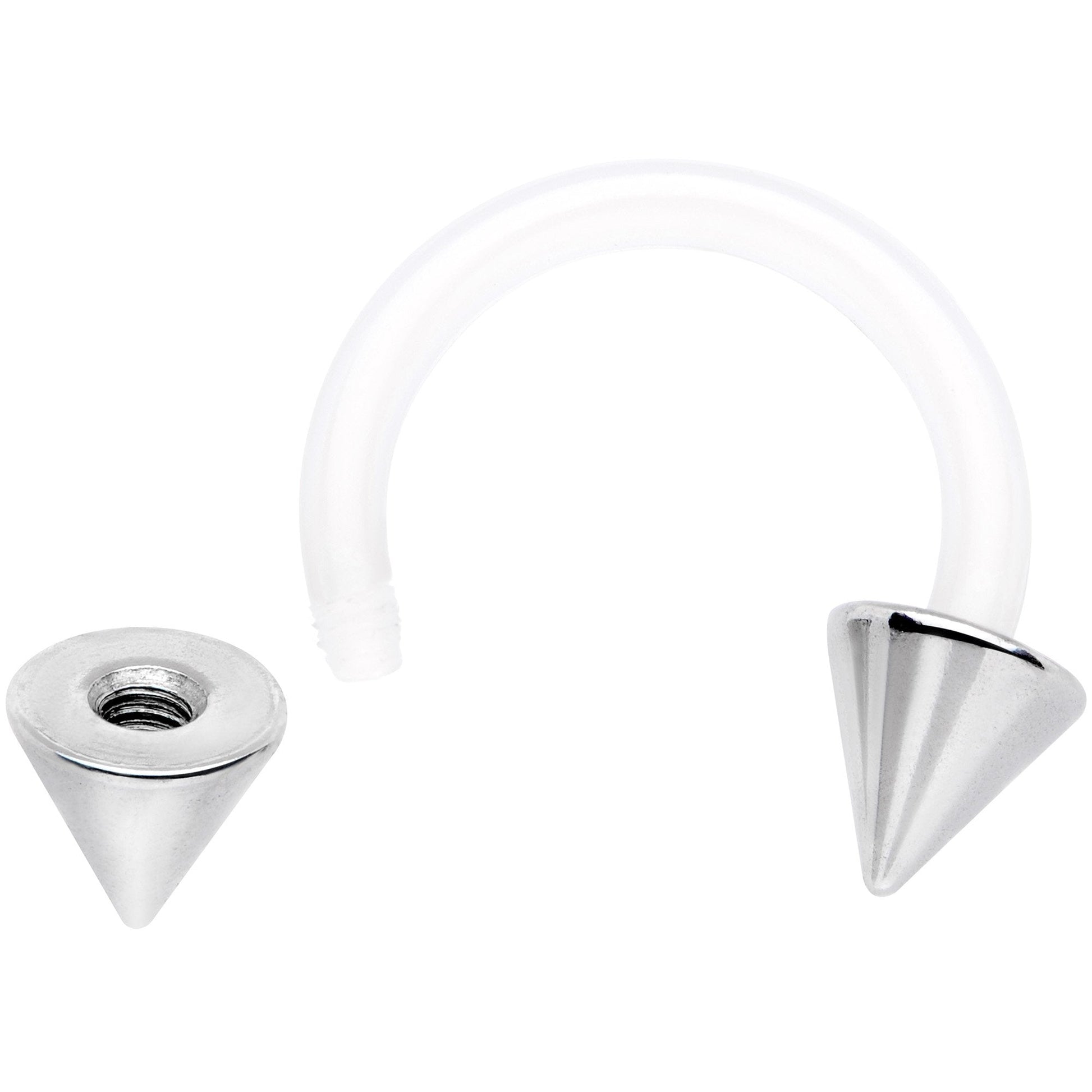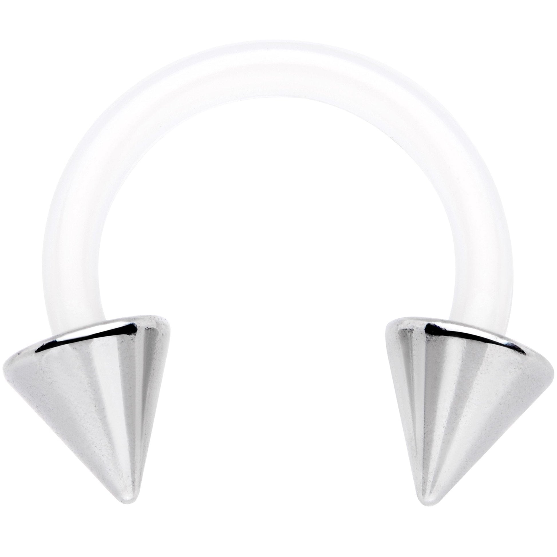 This is a horseshoe ring that really makes a point! Made of 14 gauge clear flexible Bioplast, this a whole new level of comfort for your piercing. At 10mm long, the cone-shaped ends make a dramatic statement and offer visual contrast in both the color and material. Now you can look sharp while feeling smooth with this circular barbell! Perfect for a stretched piercing or any other piercing that fits 14 gauge jewelry!Specifications