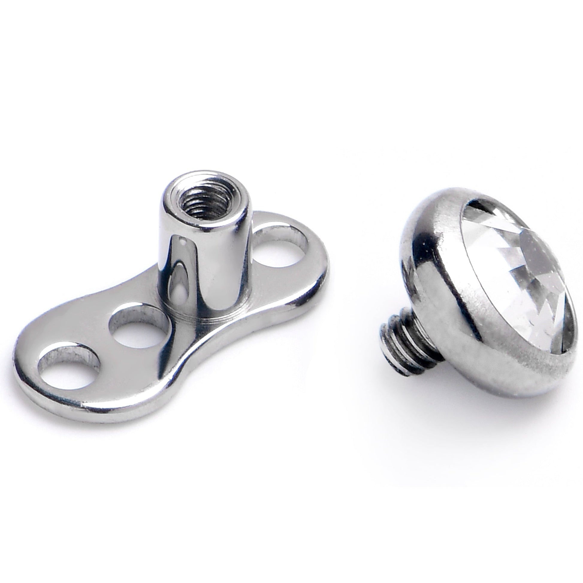 This 14 gauge dermal anchor base is made with ASTM F-136 titanium. It features a 2mm rise. It has a triple hole style anchor and an internally threaded post. It also features a 4mm bezel set clear gem top.Specifications
