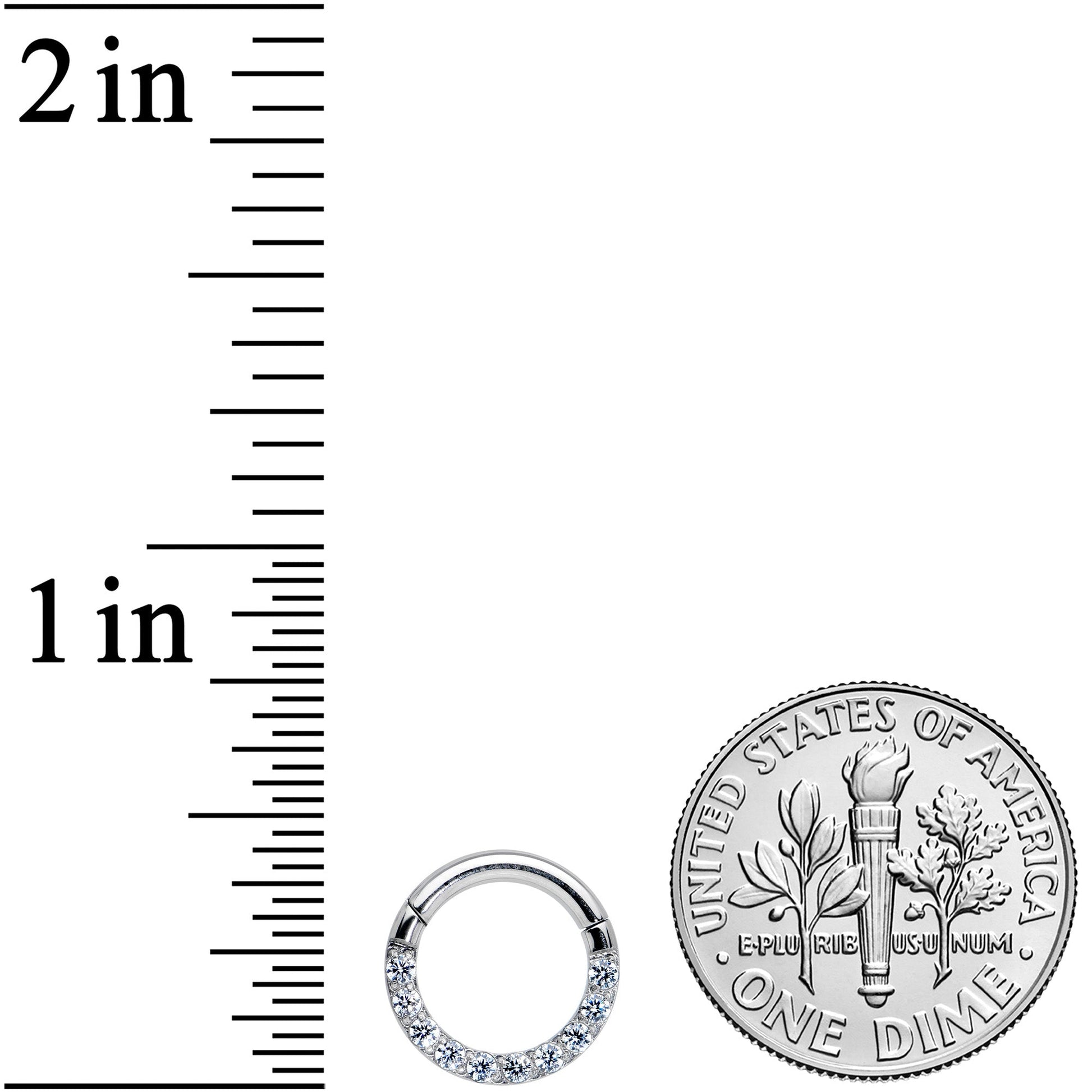 Add a look of sophistication to your cartilage piercings with this 14 gauge septum ring! It's made with an 8mm solid grade 23 implant grade titanium hinged circular ring. The bottom arc of this cartilage earring is paved with clear cubic zirconia gems for a look that's totally attention-getting without being over-the-top. It also features a hinged, non-removable segment that makes insertion and removal a snap and it works well in multiple piercings including larger-gauge tragus, helix, and septum piercings. So why be subtle when you can be ultra-glam with this fabulously extravagant cartilage ring?Specifications