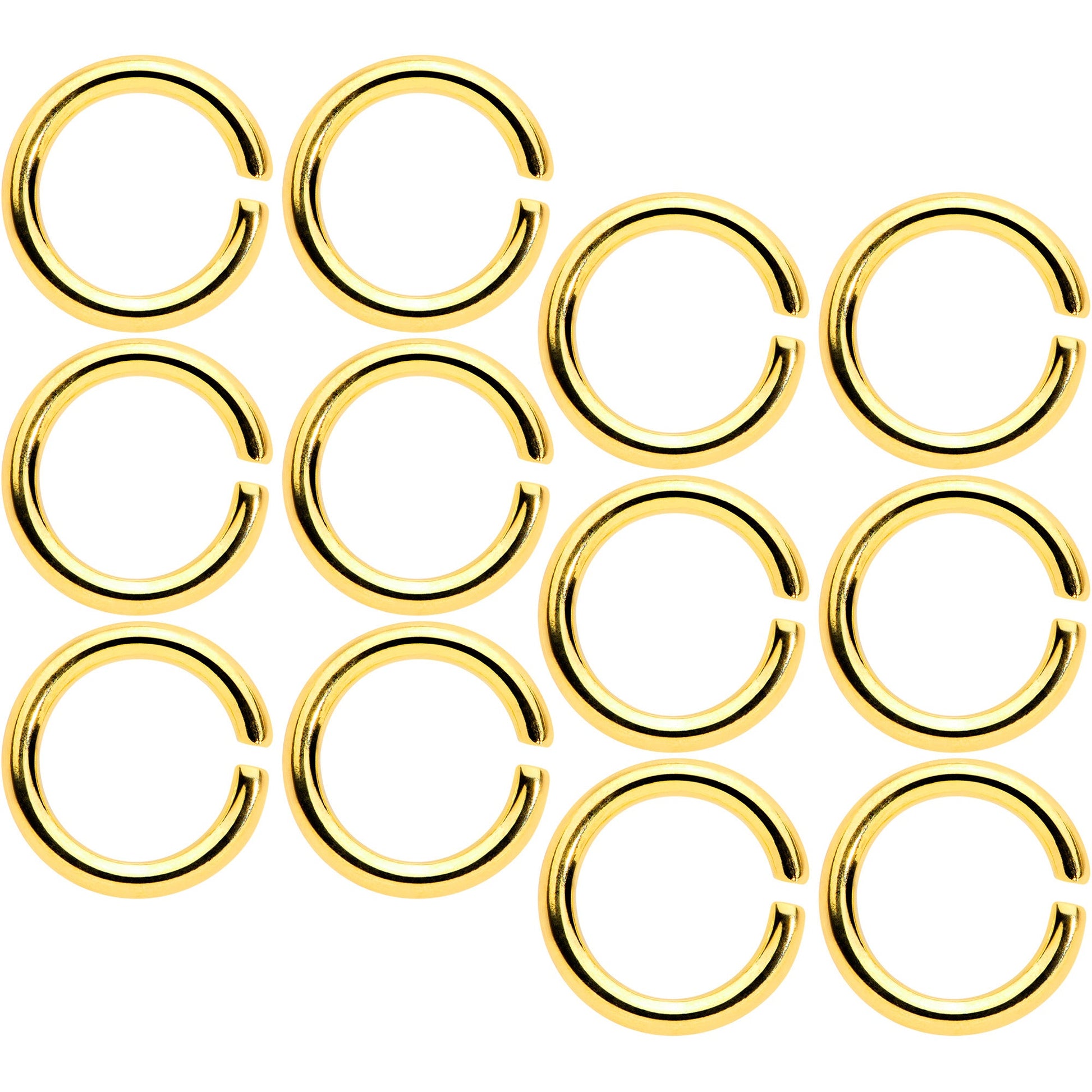 Whether you have multiple cartilage piercings and prefer a matching look or are simply prone to losing things, this set of 14 gauge cartilage rings has you covered. They're made with 8mm gold tone anodized over 316L surgical grade stainless steel circular rings for a colorful and comfortable feel. This cartilage jewelry is super easy to insert and remove - simply twist the ring open, insert, and then twist gently shut again. And you can rock these rings in multiple piercings including septum, navel, some eyebrow piercings, and stretched lobes! Sold as a set of twelve.Specifications