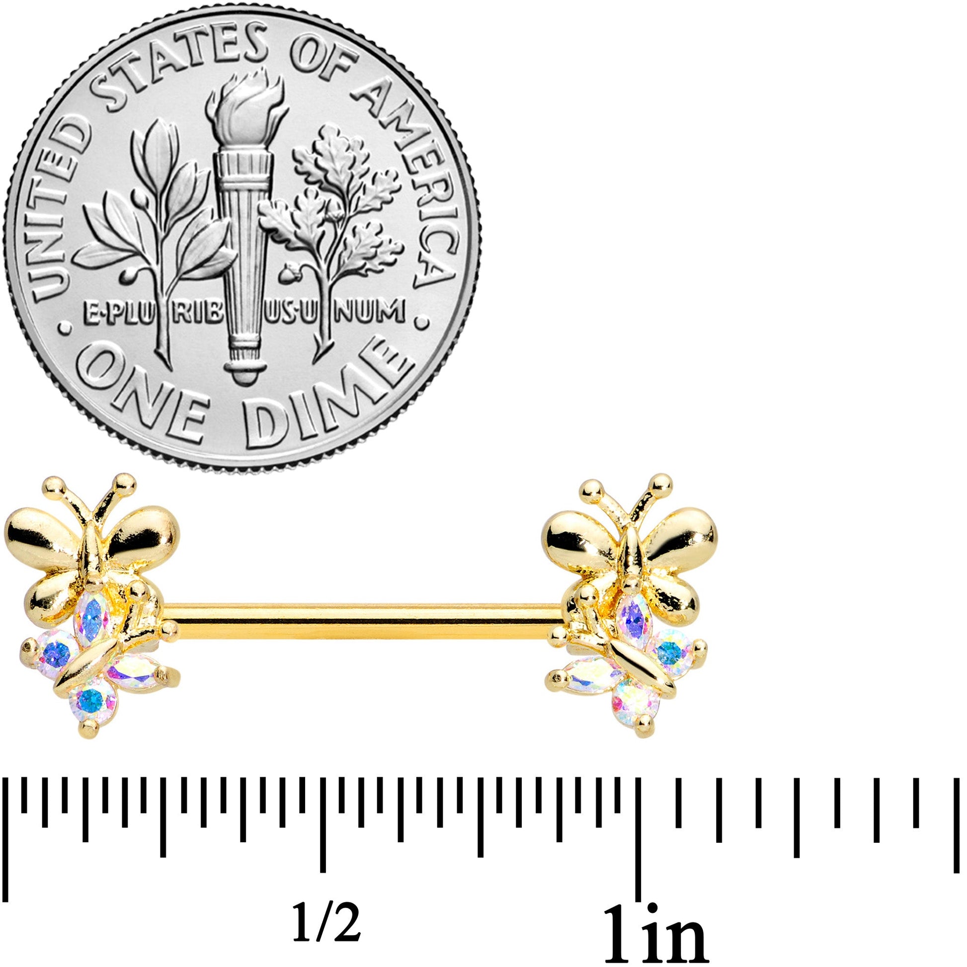 What could be better than one butterfly? Two butterflies! This 14 gauge nipple jewelry is made with 16mm gold tone plated over 316L surgical grade stainless steel straight barbells. The ends each feature a pair of butterfly charms with a butterfly sitting beneath a butterfly composed of aurora cubic zirconia gems at a slight angle. Spread your wings and give your nipple piercings a whole new look with these bewitching butterflies! Sold as a set of two.Specifications