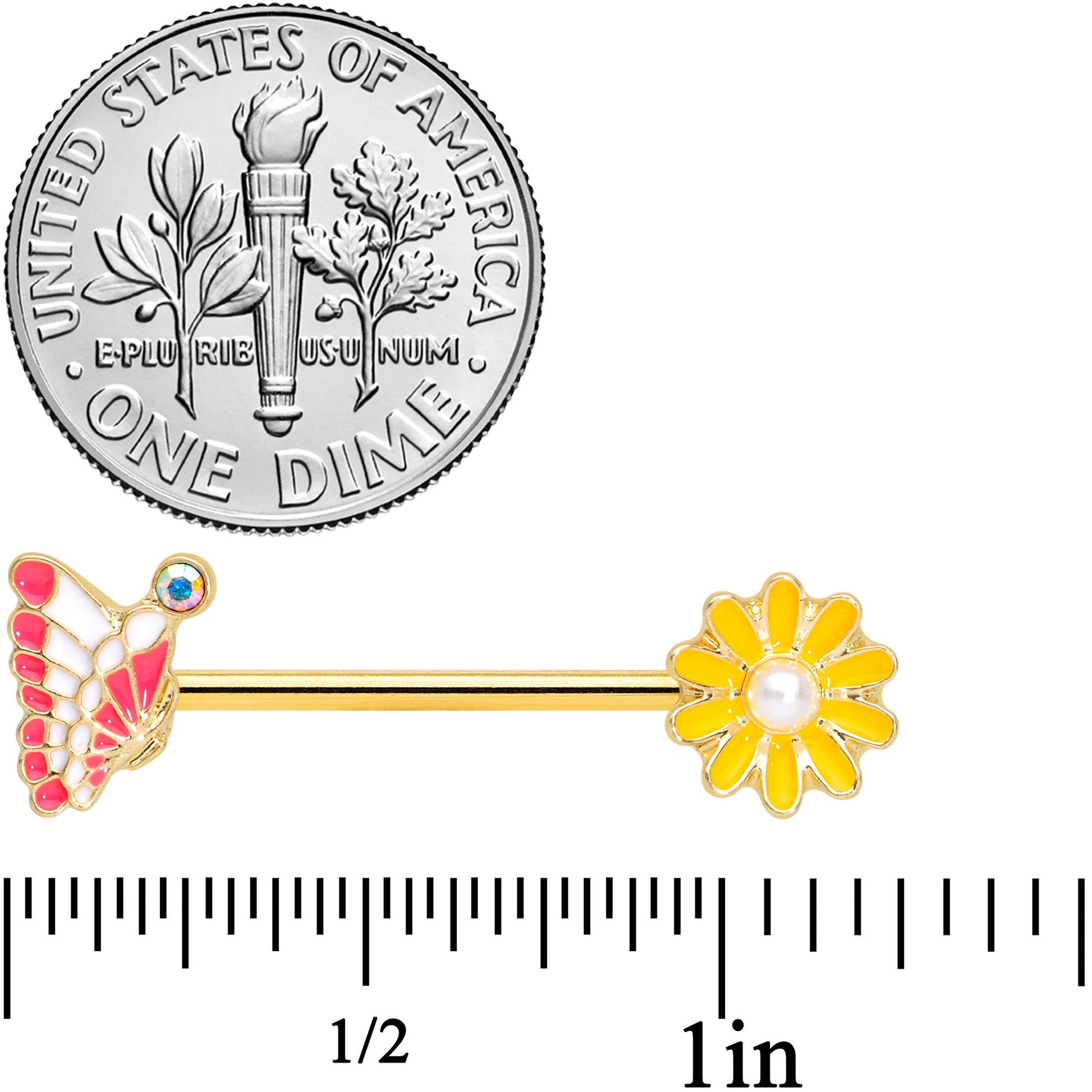 This 14 gauge nipple jewelry will have you thinking of springtime all year long! It's made with 16mm gold tone plated over 316L surgical grade stainless steel straight barbells. One end features a pink and white butterfly charm with an aurora color gem. The other end features a yellow flower charm and a matching orb set at the center of the flower. Go wild with these beautiful butterfly nipple rings! Sold as a set of two.Specifications
