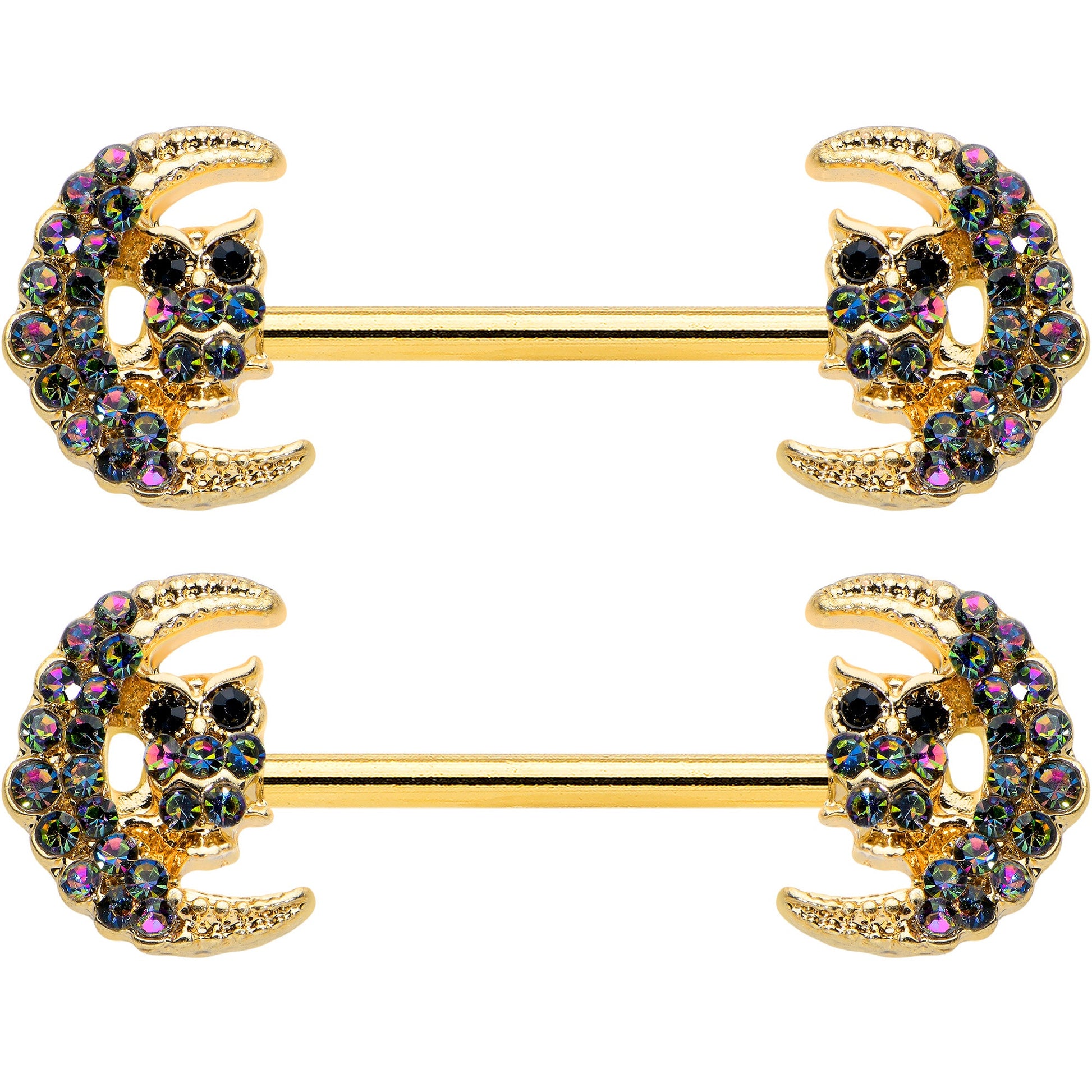 14G 5/8 Aurora Gem Gold Tone Owl Moon Barbell Nipple Ring Set
