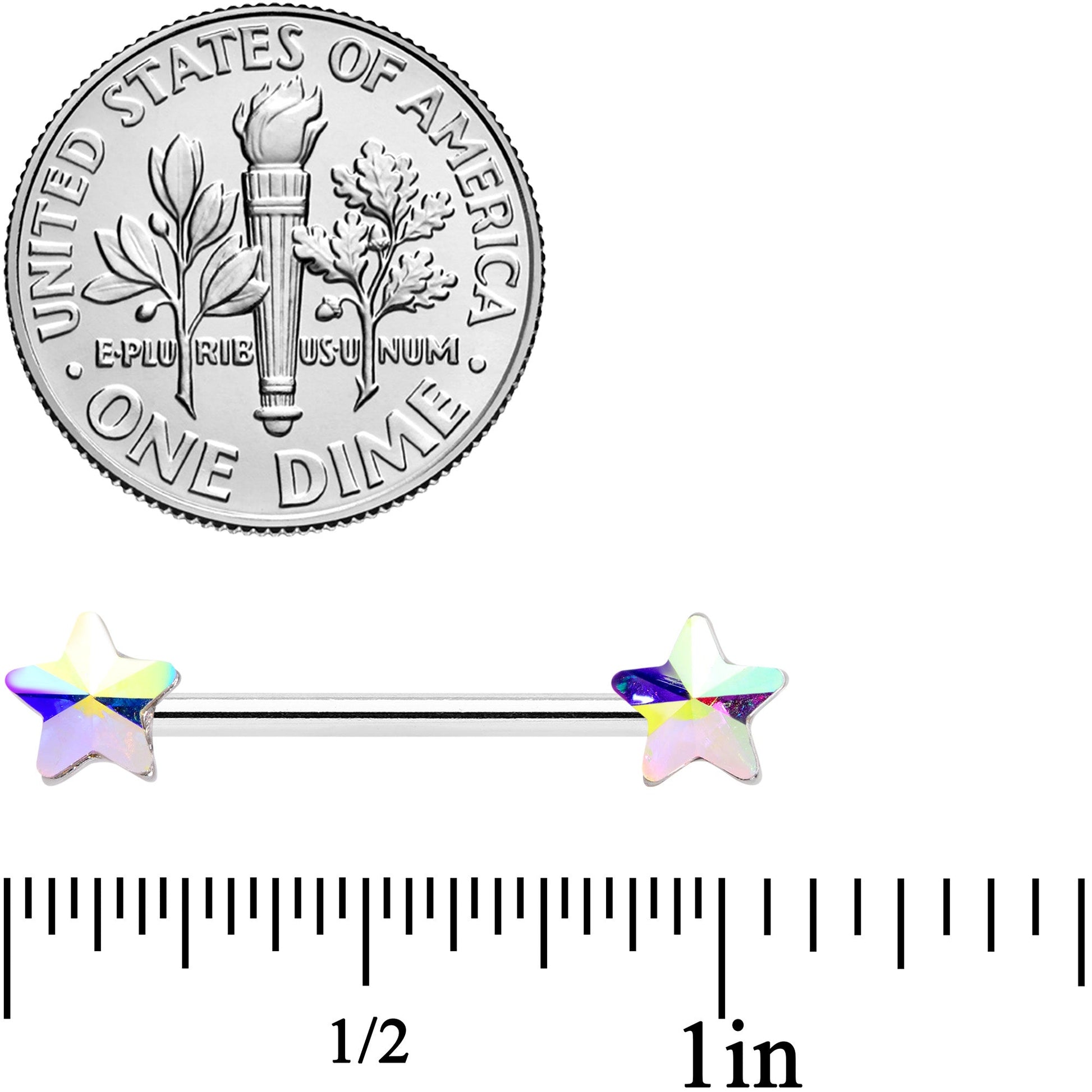 This 14 gauge nipple jewelry is absolutely out of this world! It's made with 16mm durable 316L surgical grade stainless steel straight barbells. Each of the ends features an aurora gem star charm for a look that's understated but sleek and colorful. Make a star out of your nipple piercings with these simple and striking star-themed nipple rings! Sold as a set of two.Specifications