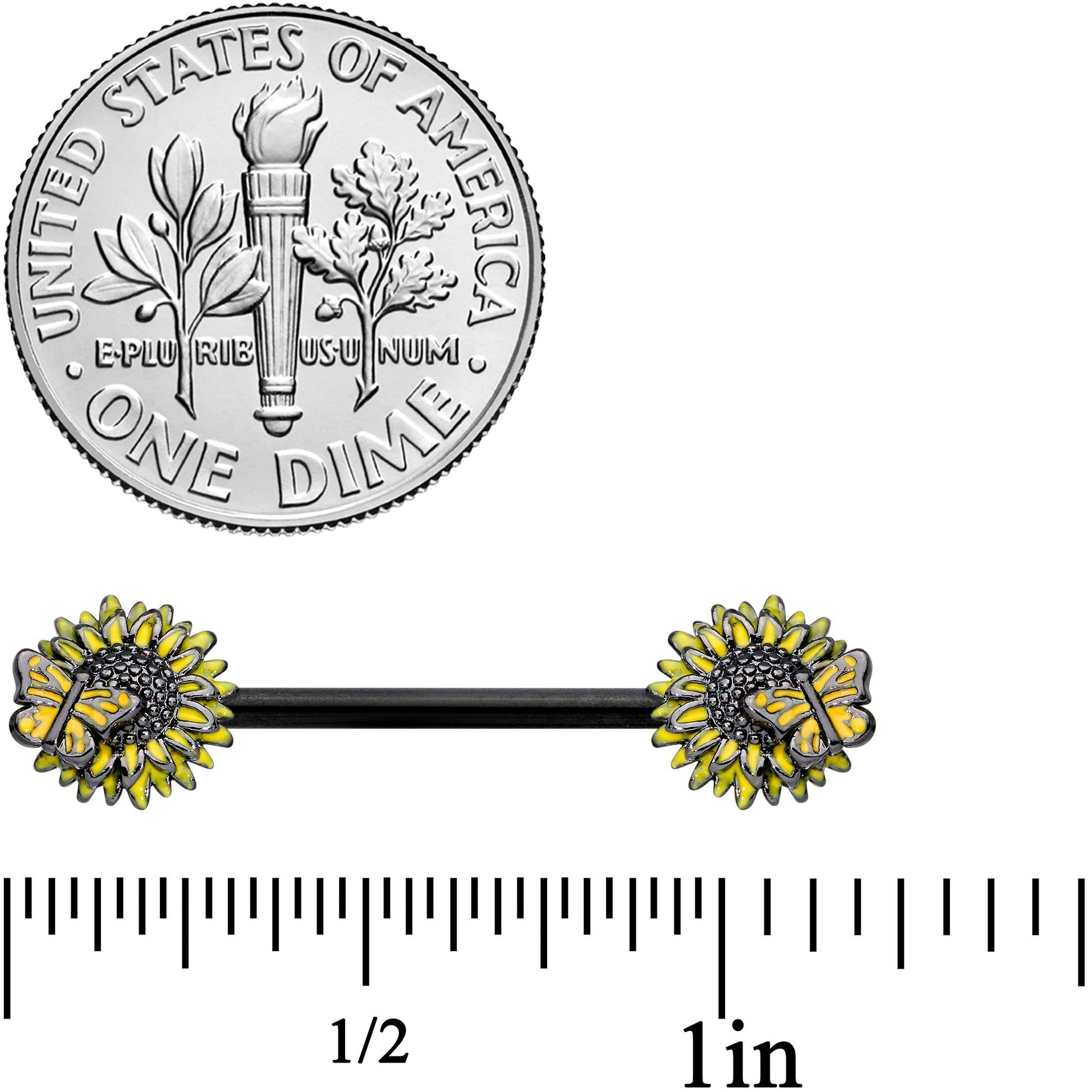 Add a little sunshine to your day - every day with this 14 gauge nipple jewelry! It's made with 16mm black PVD over 316L surgical grade stainless steel straight barbells. The ends each feature a sunflower charm with a textured center and yellow embellishment for a realistic appearance. Perched on the sunflower is a tiny butterfly in matching black and yellow. Let the sun shine all year round with these fabulous floral nipple piercing rings! Sold as a set of two.Specifications