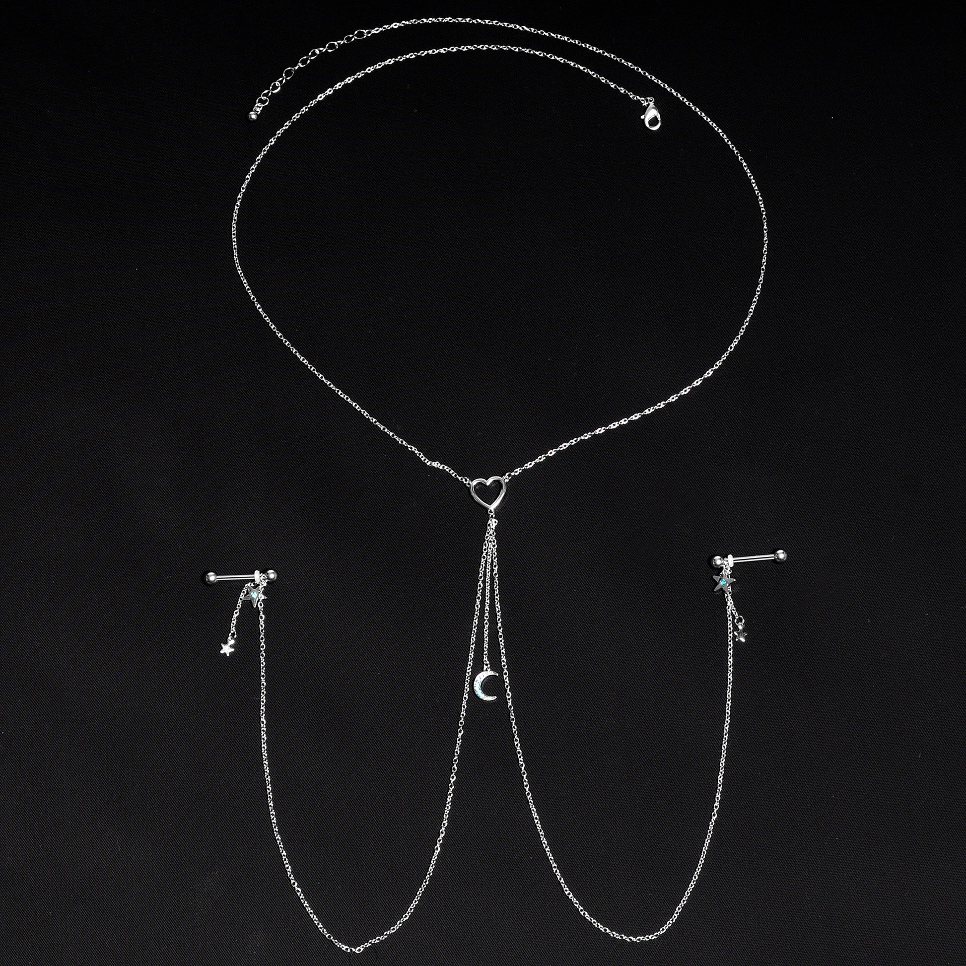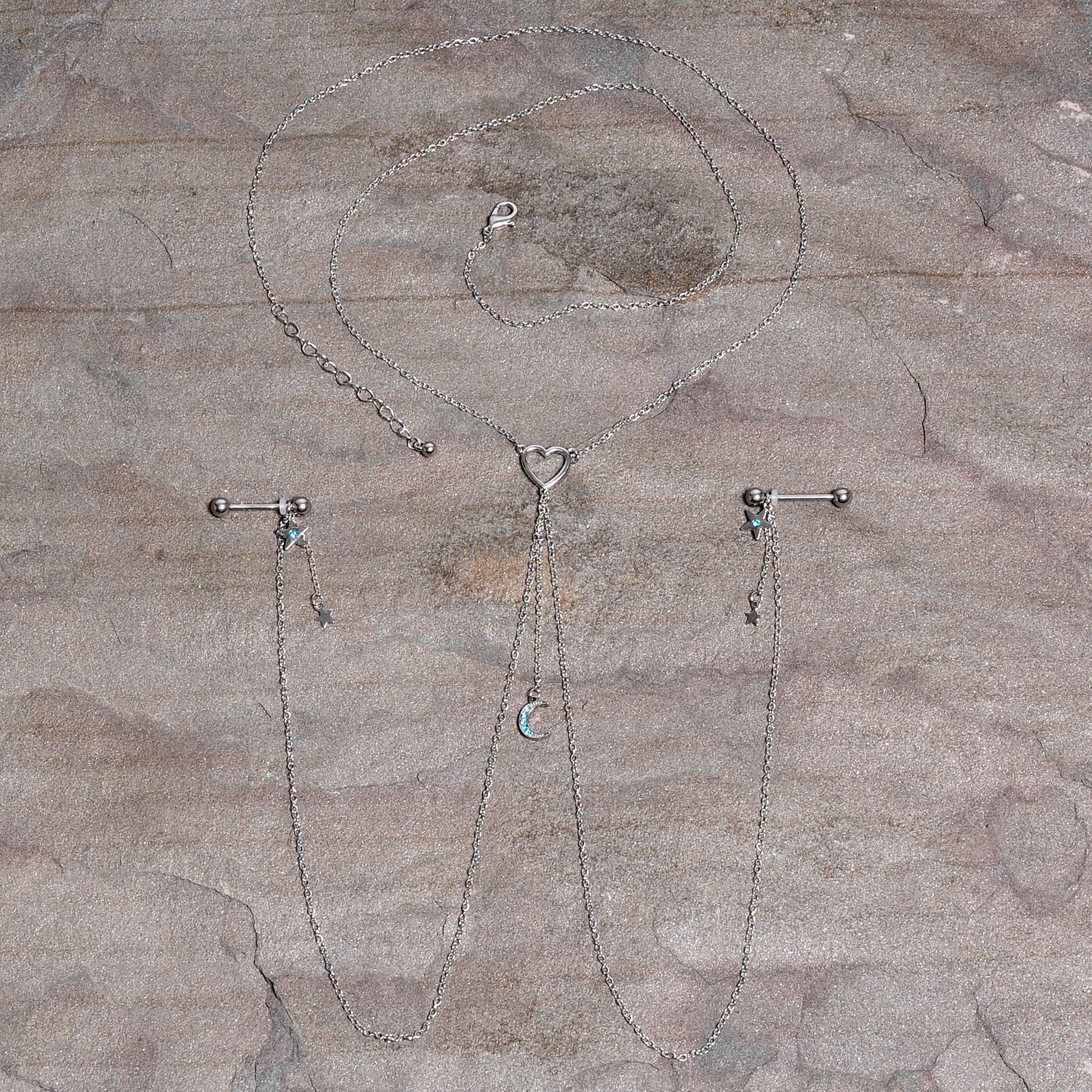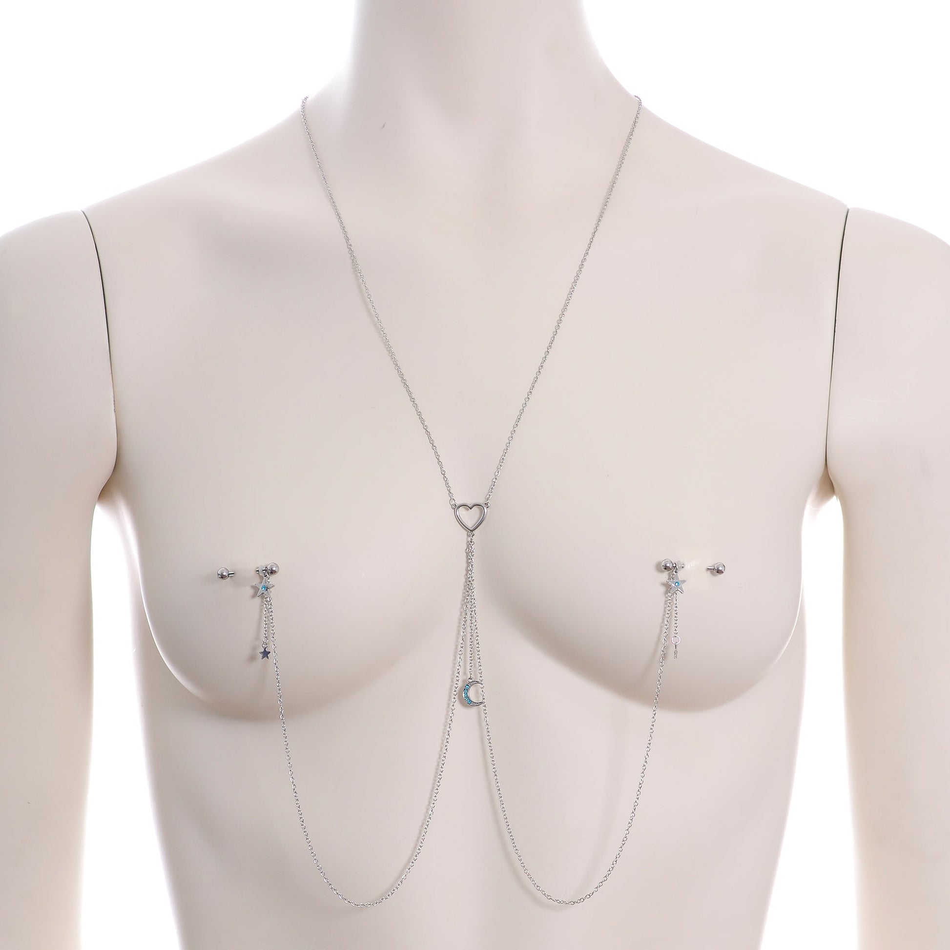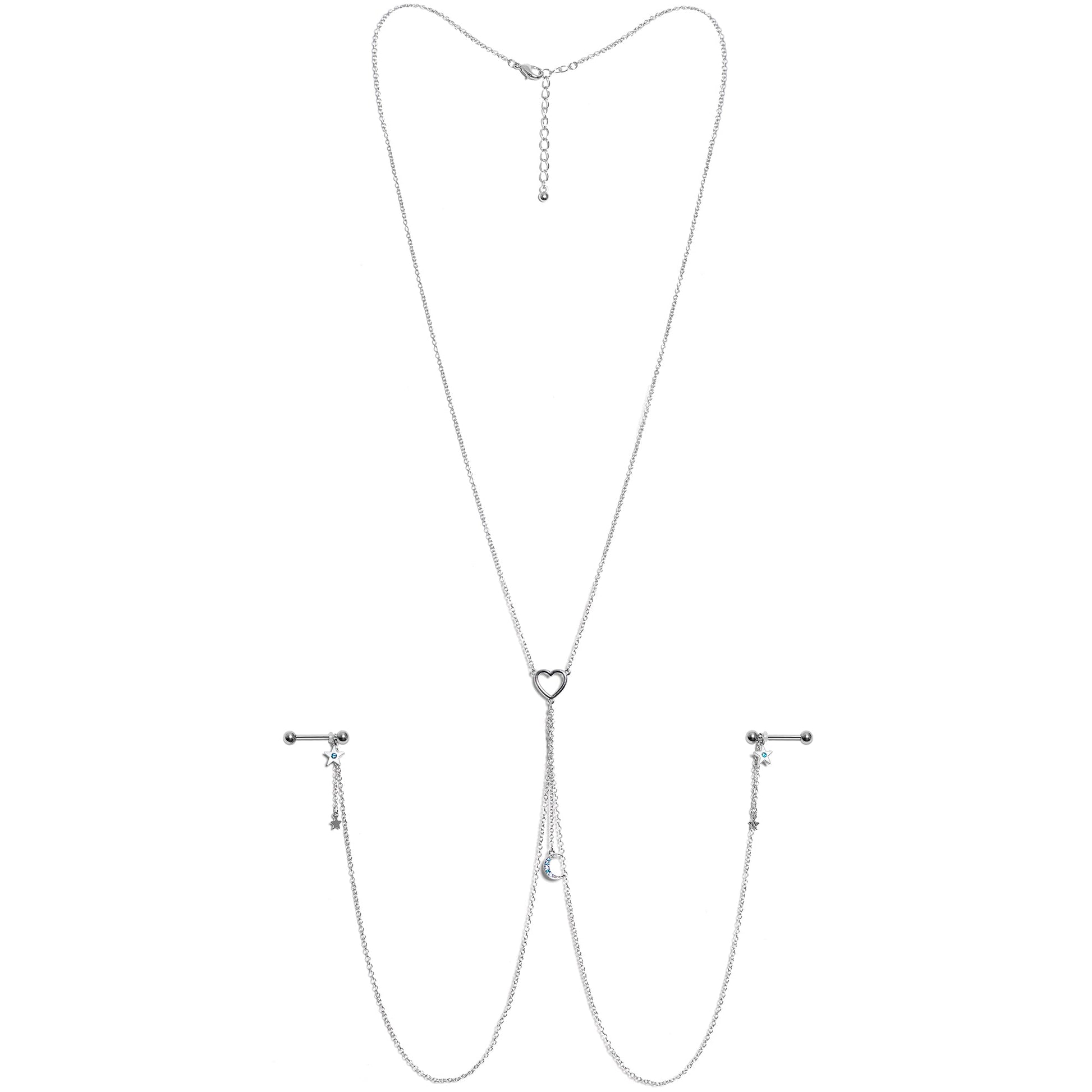 You're going to love this necklace to nipple chain to the stars and back! It features a 14" length necklace that has an openwork heart charm at the center. The heart has three lengths of matching chain dangling from it. The center one is 2" in length and supports gorgeous crescent moon charm that's set with blue gems. The other two chains are 12" and connect to the 16mm durable 316L surgical grade stainless steel straight barbells with 5mm ball ends. Dangling from the barbells are star charms with a single blue gem and tiny unadorned star charms than dangle from 1" lengths of chain. With this stunning necklace nipple chain, your piercings are sure to be stars!Specifications