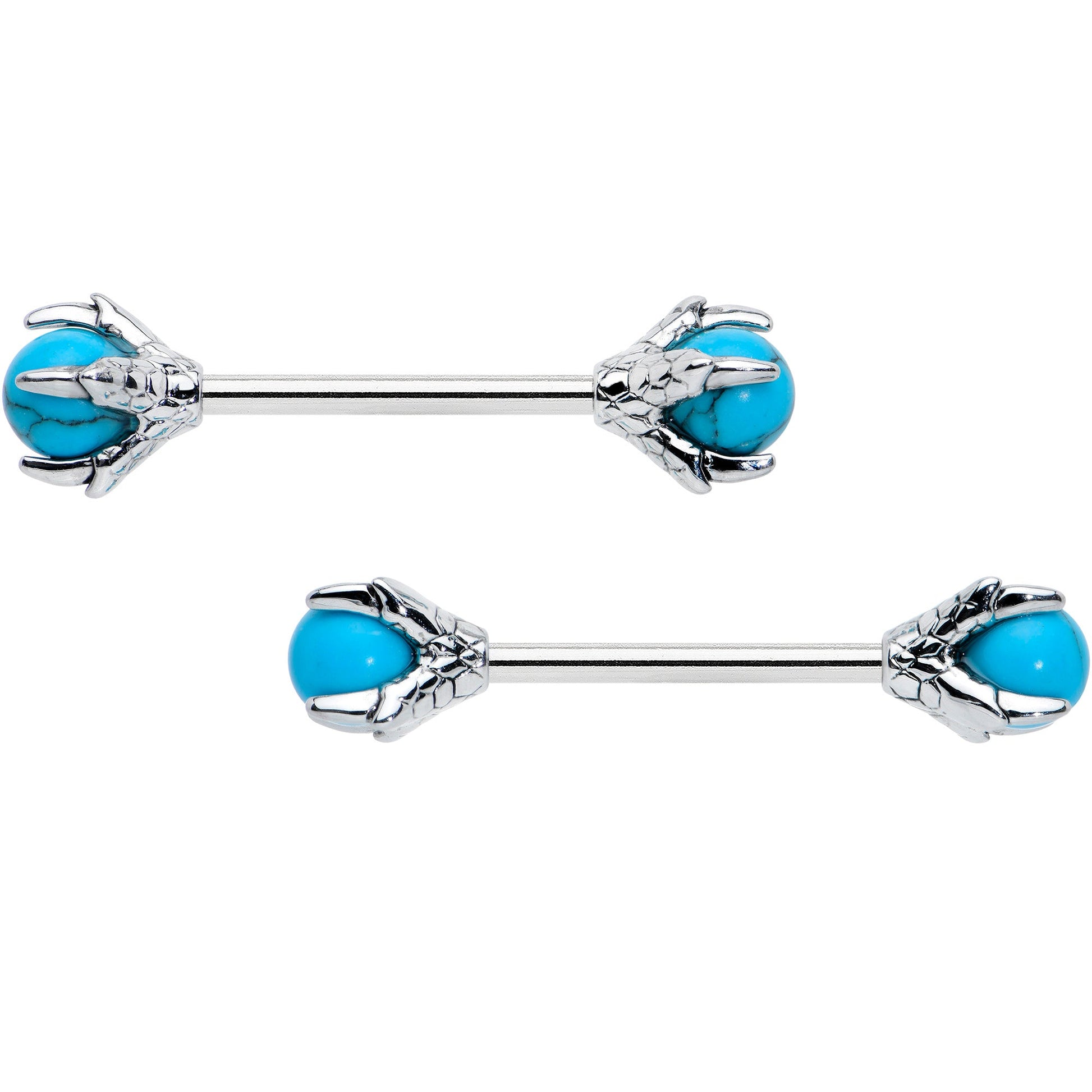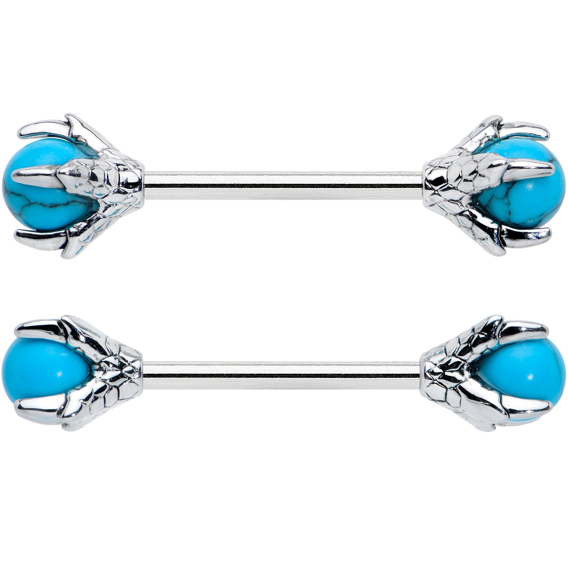 Add some creepy color to your look with this 14 gauge nipple jewelry! It's made with 16mm durable 316L surgical grade stainless steel straight barbells. Each of the ends features a matching skeleton hand clutching a turquoise stone ball. You'll be having a ball as well with these creepy cool Halloween skeleton hands in your nipple piercings! Sold as a set of two.Specifications