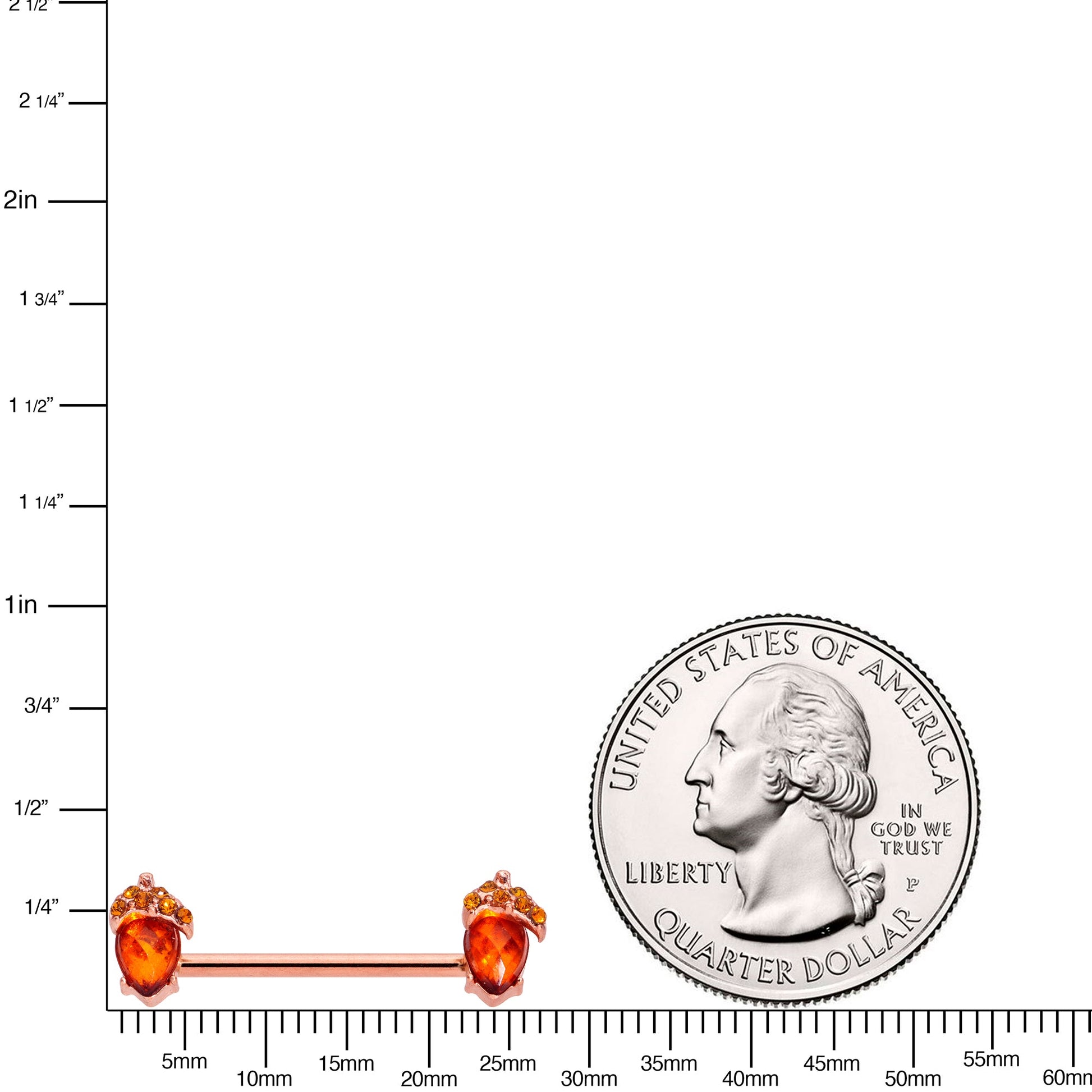 Let your look grow into something big with this 14 gauge nipple jewelry! It's made with 16mm rose gold tone PVD over 316L surgical grade stainless steel straight barbells. Each of the ends features an acorn charm with the body composed of a single brown gem. The acorn's cap is set with more brown gems for a cohesive and realistic style. Let nature's own beauty lend some agrarian appeal to your nipple piercings with this arboreal acorn nipple jewelry! Sold as a set of two.Specifications