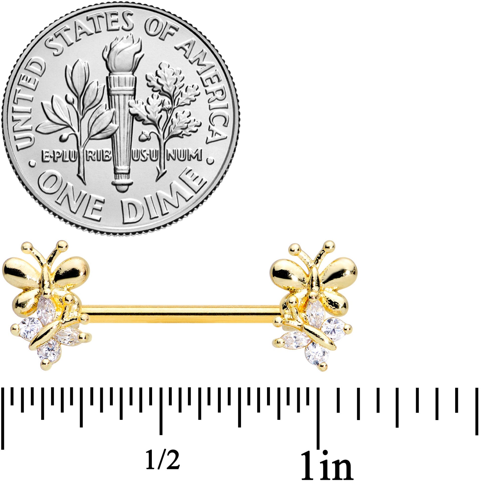 14G 5/8 Clear CZ Gem Gold Tone Butterfly Barbell Nipple Set