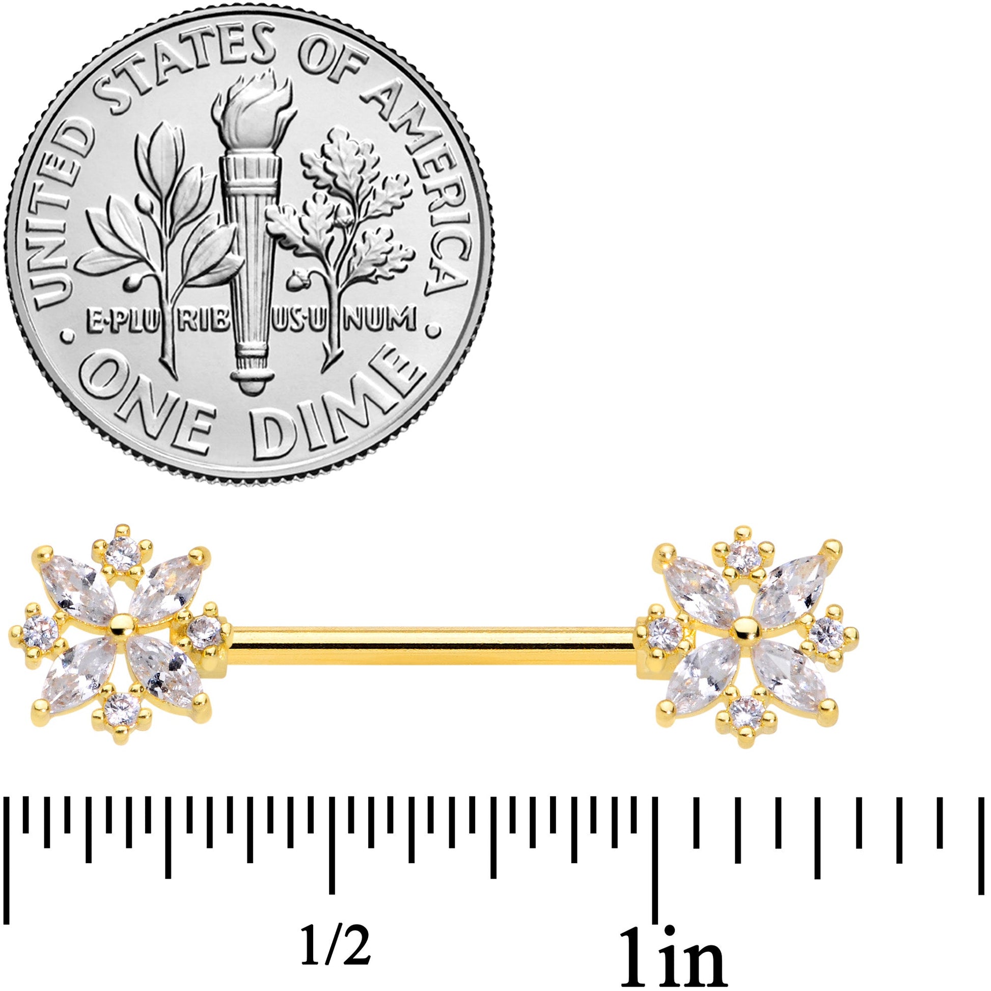 The stars are bursting with style on this 14 gauge nipple jewelry! These nipple piercings are made with 16mm gold tone plated over 316L surgical grade stainless steel straight barbells and feature star charm with four points composed of clear cubic zirconia gems, with stars set with clear cubic zirconia gems in between each arm. With such luxurious style, these nipple rings will leave you positively starry-eyed! Sold as a set of two.Specifications