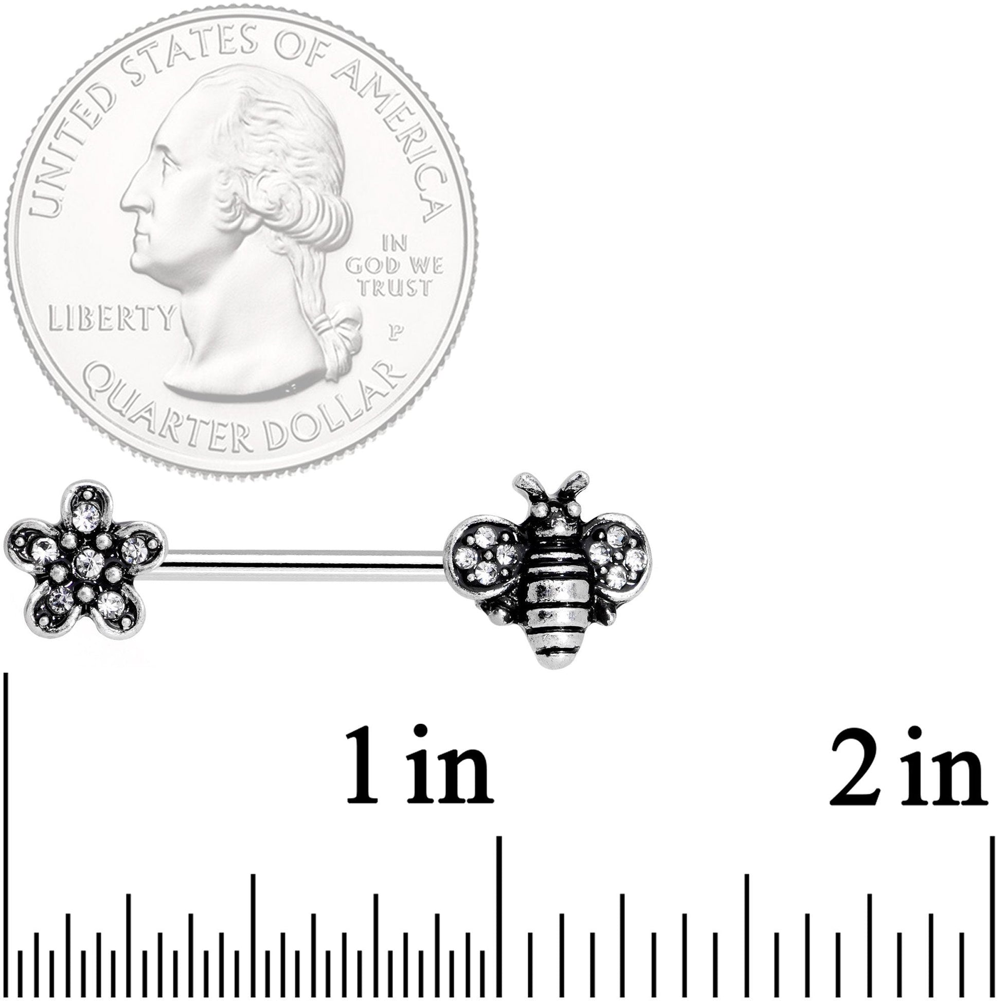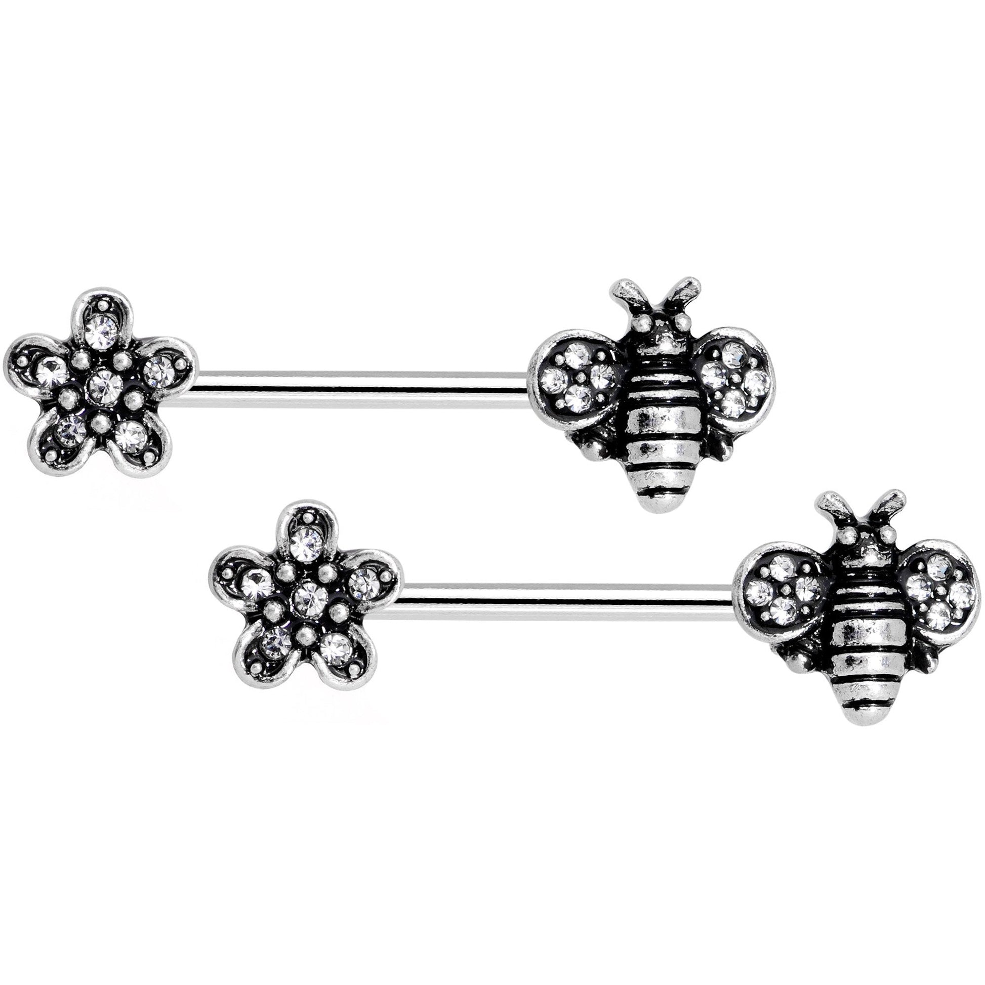 14G 5/8 Clear Gem Bee and Blossom Barbell Nipple Ring Set
