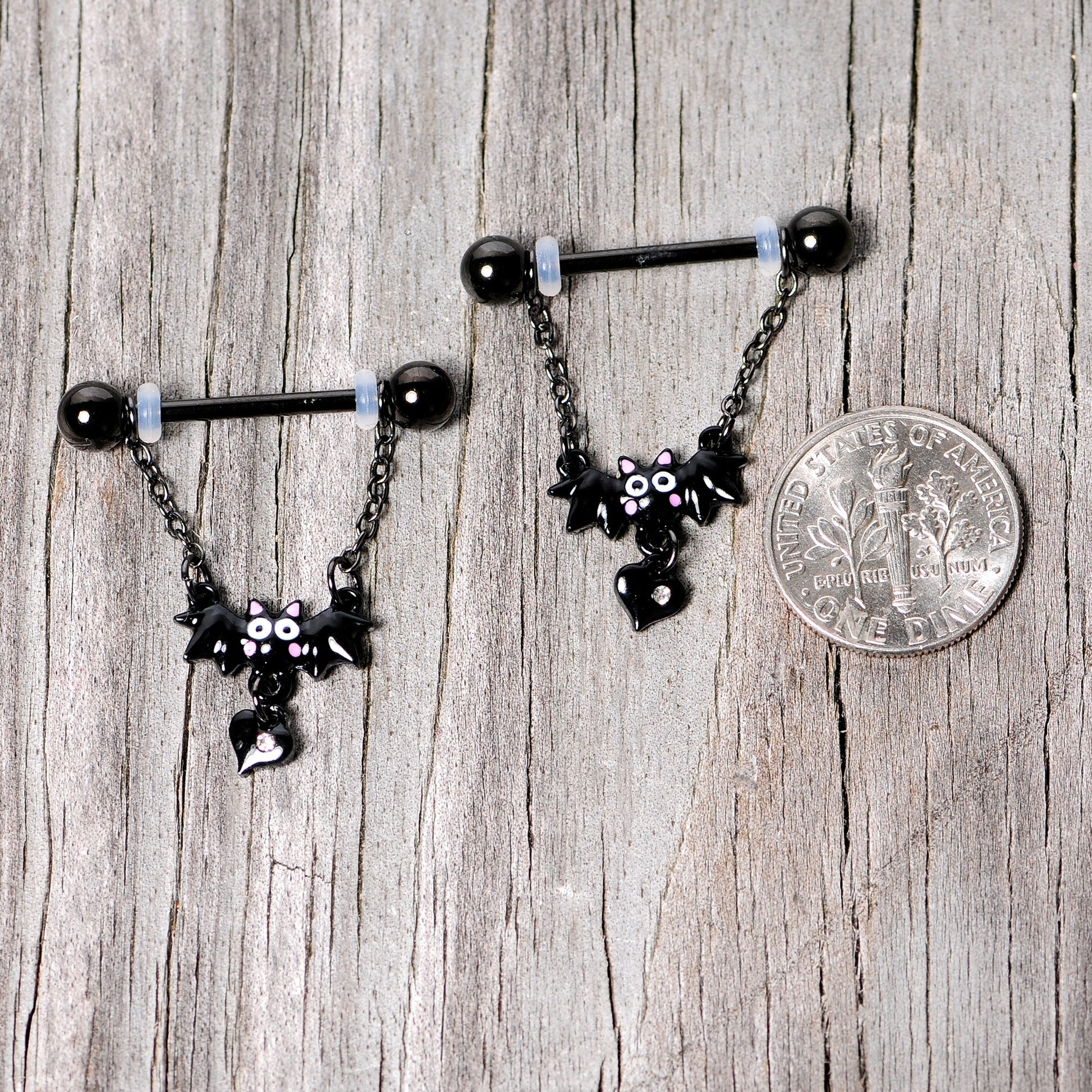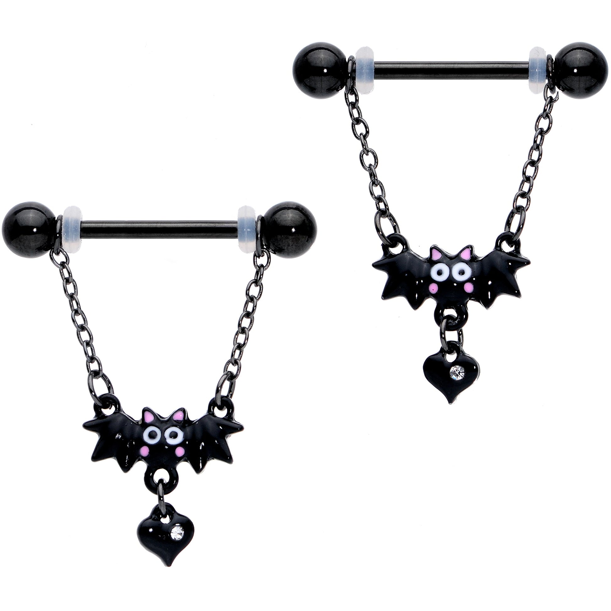 If Halloween is your favorite holiday, you're sure to be besotted with this 14 gauge nipple jewelry! It's made with 16mm black plated over 316L surgical grade stainless steel straight barbells with 5mm ball ends. The barbell supports a length of matching chain that can be adjusted along the length of the barbells. Dangling from the center of the chain is an adorable little bat charm. This little sweetie is carrying a little heart, set with a tiny clear gem. This beautiful bat jewelry is sure to steal your heart as well! Sold as a set of two.Specifications